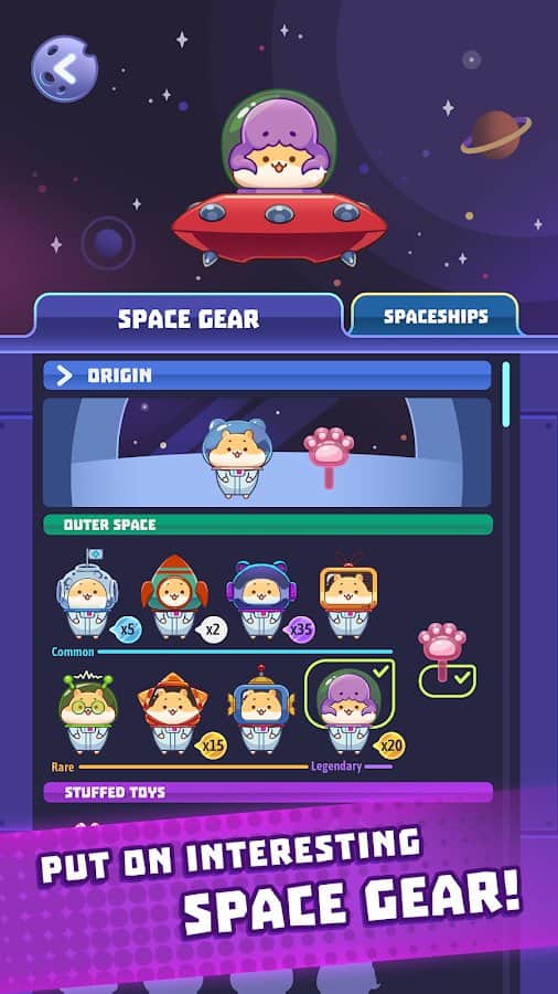 Вы попали в мир хомячков, которые ищут другую цивилизацию. Много лет назад они отправили экспедицию в космос, которая так и не вернулась. Со временем у них стало больше знаний, поэтому помогите им найти и спасти других животных в мире Claw Stars! Это мини-аппарат, где нужно вытягивать капсулы клешней и смотреть что внутри (милые существа или бонусы). Сражайтесь с друзьями, меняйте внешний вид скафандра и космического корабля, коллекционируйте карточки, переходите в новые миры вселенной и давайте жизнь.