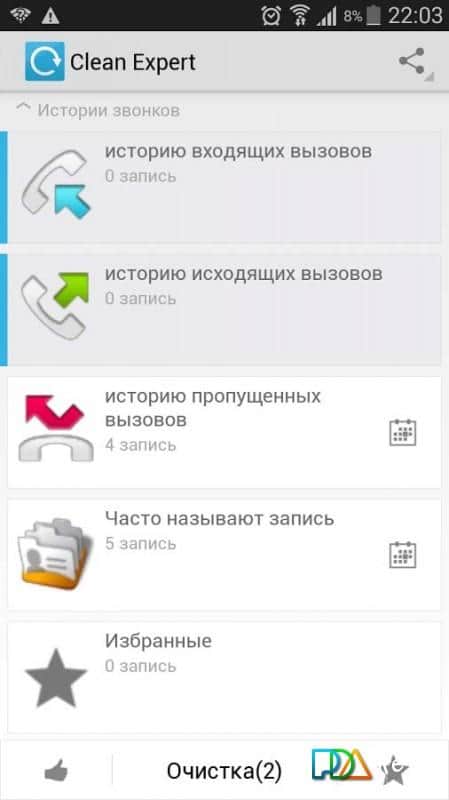 Очистит все вызовы (входящие, исходящие, пропущенные)