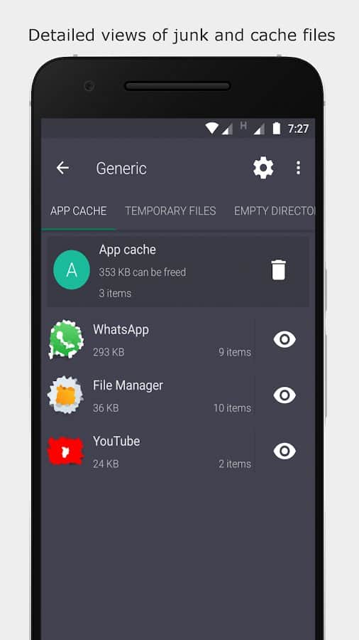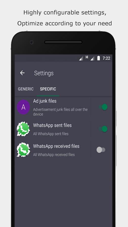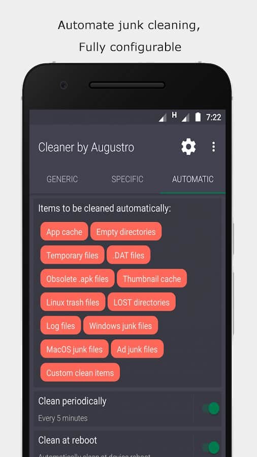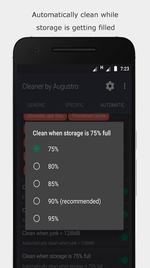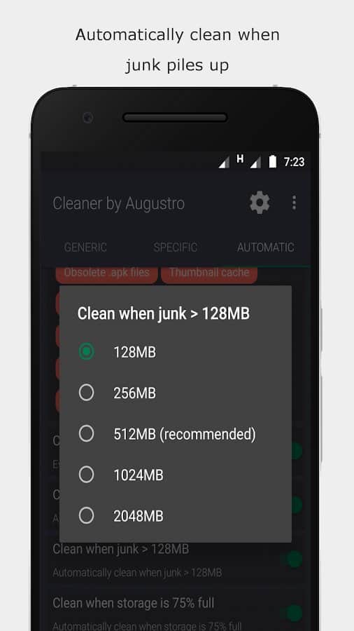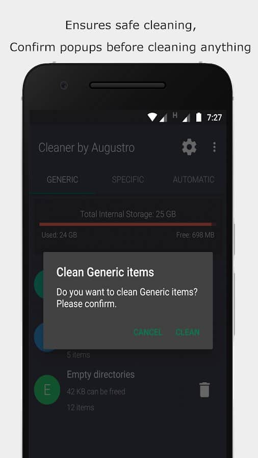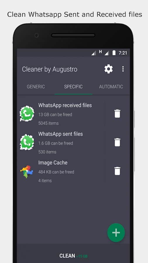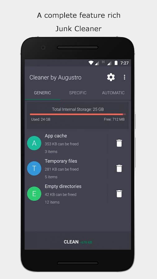 Cleaner by Augustro не только автоматически чистит память устройства, оптимизируя его работу, но и сканирует мусорные файлы, увеличивает свободное место. Это мощный и многофункциональный инструмент, который понадобится любому смартфона на базе Андроид. Такие возможности, как очистка кэша и внутренней памяти, подтверждение процесса при помощи всплывающих окон, несколько типов конфигурации, ручная и автоочистка Whatsapp, исключение некоторых файлов, папок, виджет на главном экране, понравятся каждому пользователю.