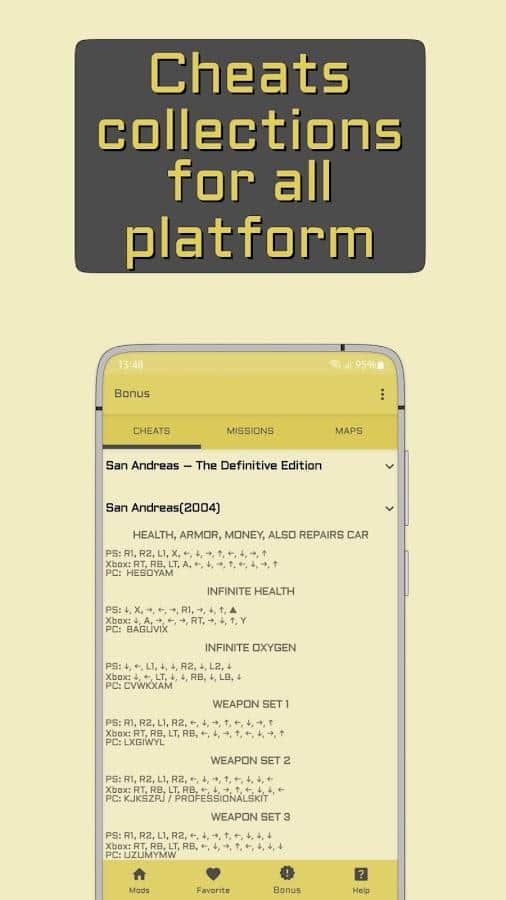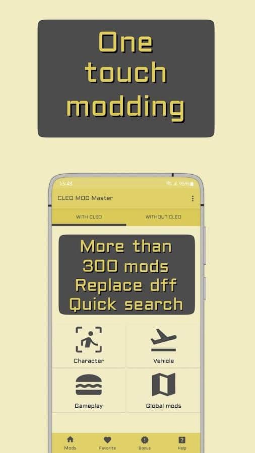 Быстро и просто улучшите игру Grand Theft Auto San Andreas с помощью приложения CLEO MOD Master, где собрано большое количество модов. А именно больше 200: неуязвимость, 100% сохранение, меню с читами, оружие в две руки, выбор внешнего вида, ядерный мод SA, телепортирование, сумасшедший поезд, хендлинг, цунами, игра от первого лица, бессмертие, модификации тачек, охрана дома, призыв зомби, пешеходы с телефонами, разные боевые стили, турбо-режим, цифровой спидометр, приглашение друзьям, воздушный транспорт и прочее.