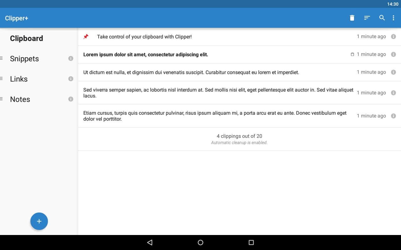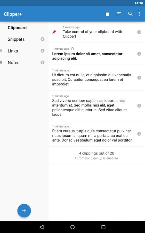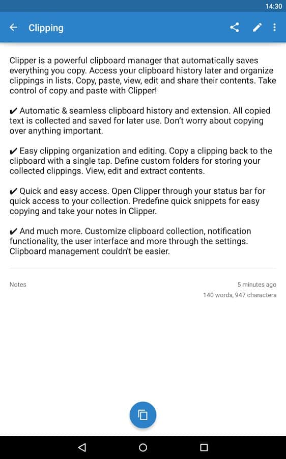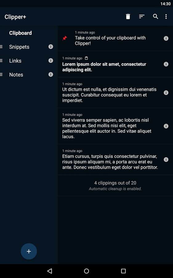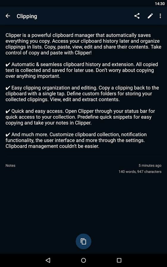 Clipper - Clipboard Manager - Теперь вам не обязательно сохранять ваши тексты куда то, ведь для этого было создано это приложение. Оно простое, и исполняет очень важную функцию, это менеджер буфера обмена, и он сохранит всё то что вы скопировали когда то. Даже если вы потеряли этот текст, вы можете зайти в это приложение, и отыскать его там. Так же вам будет доступна функция редактирования, так что вы всегда сможете изменить его. Что бы информация не путалась, вы сможете создавать раздельные списки, и добавлять в них различные заметки.
