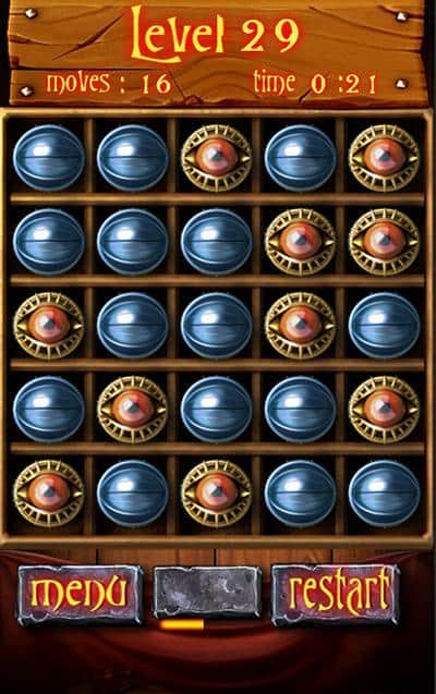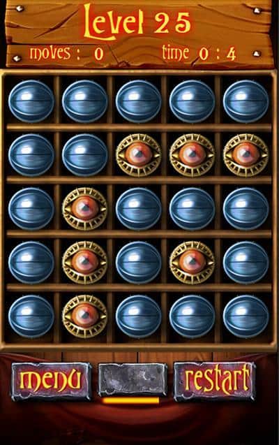 CloseEyesPuzzle – увлекательная головоломка на андроид, сделанная в мистической графике, где главной вашей целью будет закрыть все глаза. На поле расположены открытые и закрытые глаза вашей задачей будет закрыть все глаза щелкая по ним, в зависимости от состояния, соседние ячейки с глазами будут открываться или наоборот закрываться. Чтобы пройти уровень закройте все глаза, если у вас это не получается то нажмите кнопку пропустить и переходите на следующий уровень, но очки вам не зачисляться. Попробуйте пройти все 60 неповторимых уровней и заработать как можно больше очков.