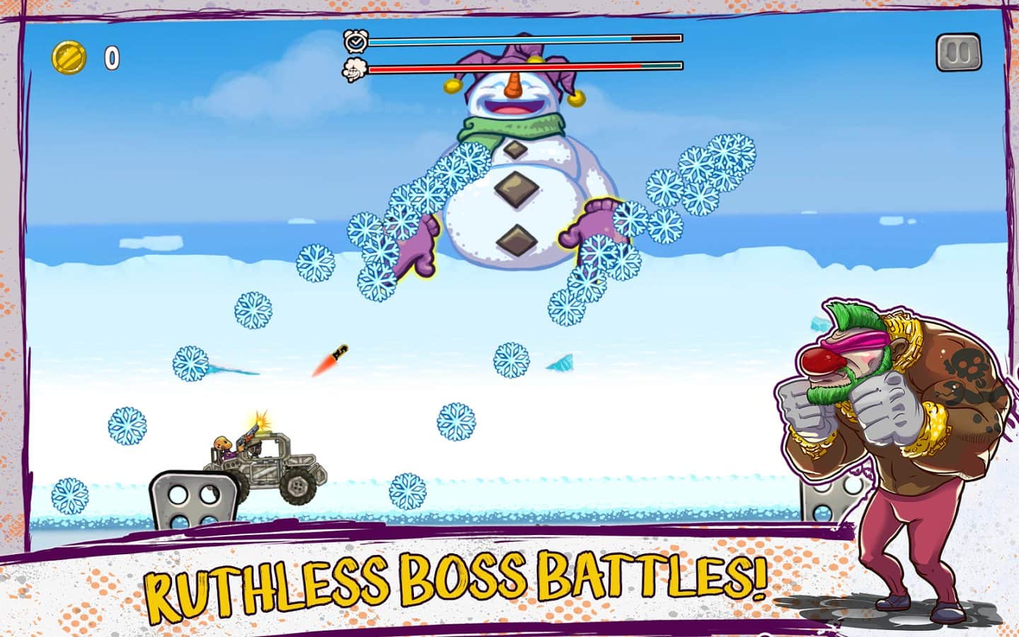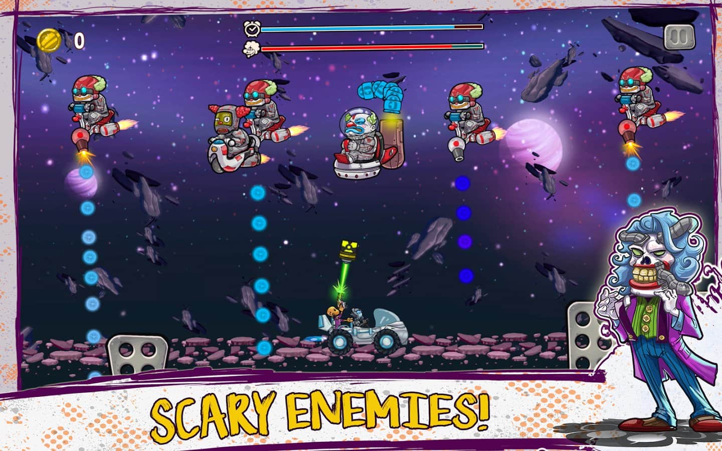 Clown Squad – возьмите под свой контроль главного героя, который ездит на машине и старается уйти от преследования клоунов-убийц. В этой игре вы будете гонять по многочисленным трассам, которые таят в себе множество опасностей и ловушек. Управляйте передвижением героя и проедьтесь по бесчисленным равнинам, саваннам и холмистой местности при этом, ведя огонь из оружия по клоунам которые хотят напасть на вас. В конце каждого уровня вас будет ждать встреча с опасным боссом, победив которого вы сможете пройти на следующий уровень. Открывайте для себя новые мощные автомобили и продолжайте движение.