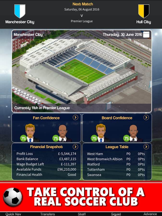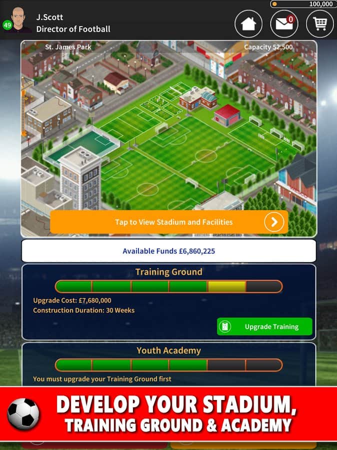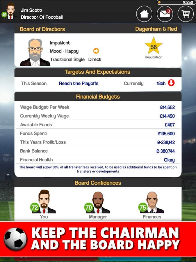 Club Soccer Director 2018 - Football Club Manager – игра на андроид, где вы станете менеджером футбольной команды. В этой игре вы должны взять под опеку футбольный клуб и привести его к мировому успеху. Выбирайте себе футбольный клуб из Англии, Франции, Германии, Италии и Испании или соберите свою команду с нуля. Приобретайте подающих надежды футболистов и тренируйте их, добиваясь отличных результатов. Нанимайте на работу опытных тренеров и других работников, стройте огромные спортивные комплексы и проводите каждый день тренировки. Привлекайте спонсоров и получайте их деньги на развитие своего футбольного клуба.