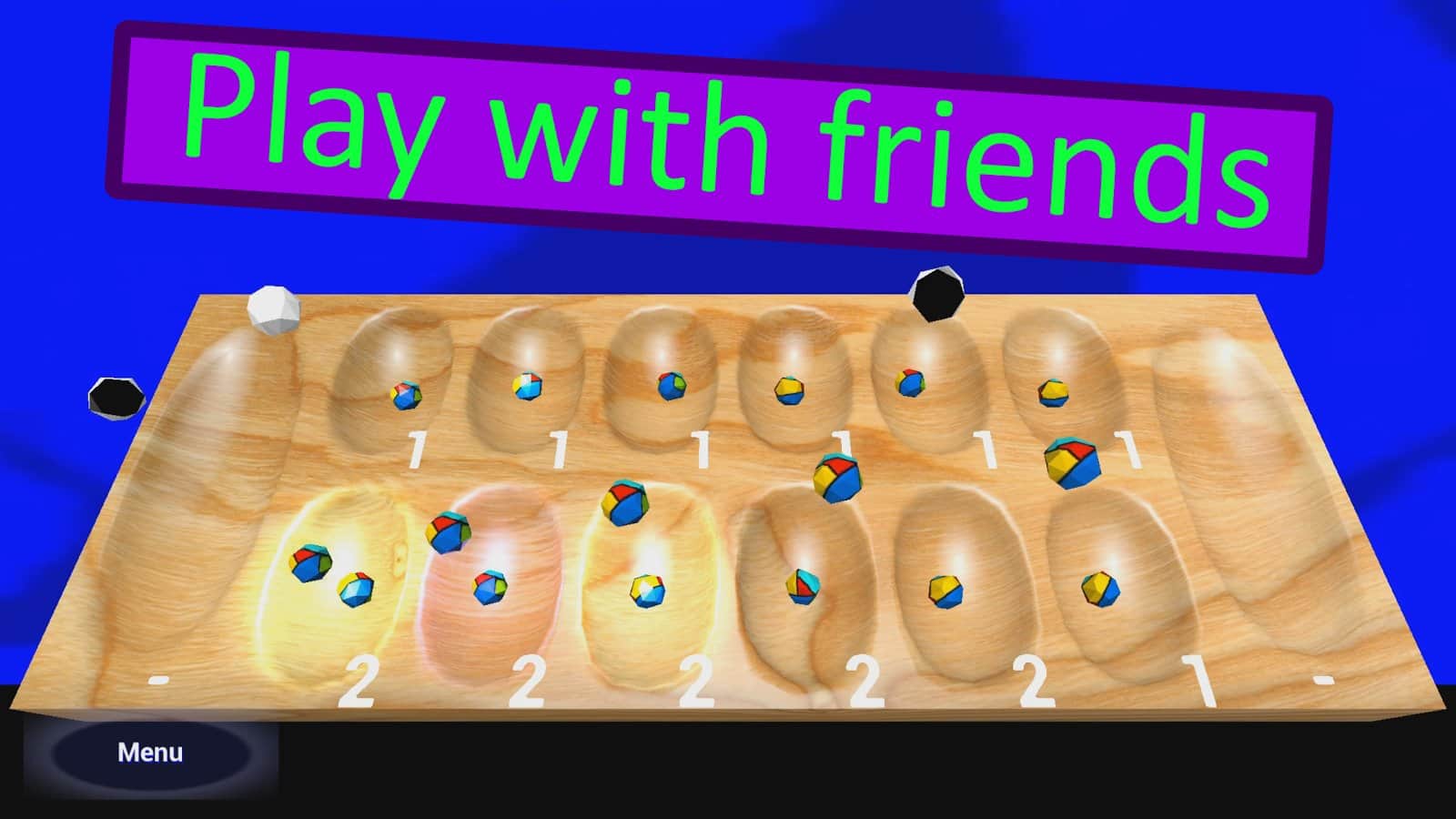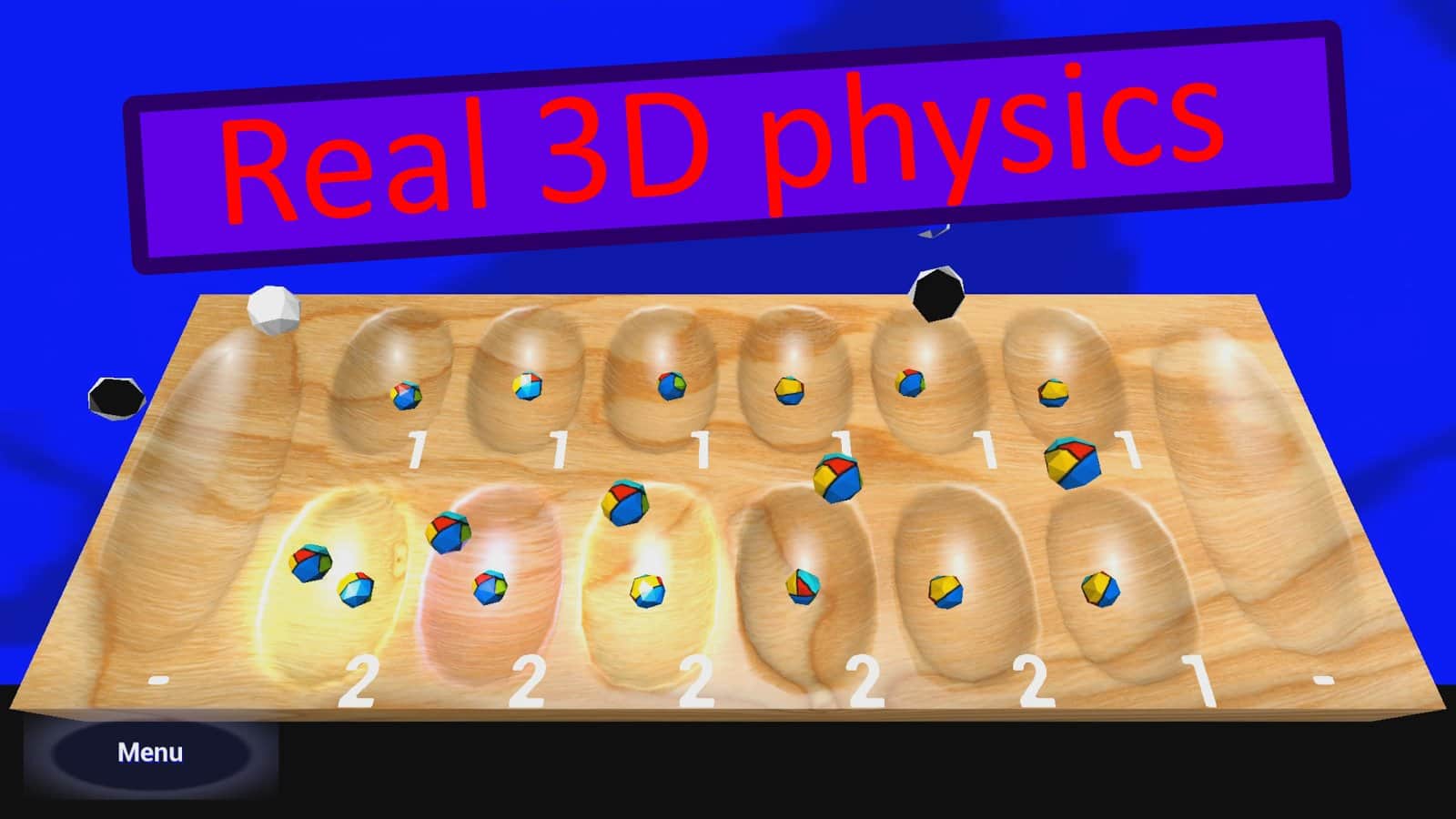 Colored Stones 3D – настольная игра на андроид, рассчитанная для двух игроков. В этой игре перед вами окажется доска, на которой находятся шесть маленьких лунок с каждой стороны для двух игроков и по одной большой, где находятся разноцветные камни. В игре вашей задачей будет поочередно брать с одно лунки камень, и перекладывать ее в последующую по часовой стрелки, начиная с правой. Цель игры заключается в том, чтобы в конце игры в последней лунке оказались все камни, если их будет меньше чем у вашего соперника, то он выиграет и заберет все камни. Набирайте достаточное количество камней и выигрывайте игру.
