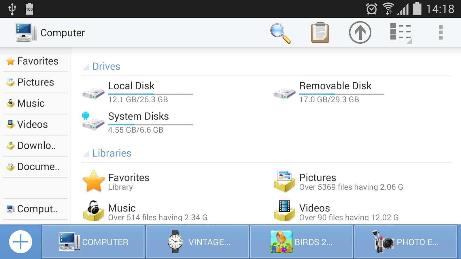 Computer - это практически идентичная копия проводника «мой компьютер» с Windows XP. Вы сможете стандартно просматривать папки в виде крупных значков, мелких значков и таблицы (настройка на ваш вкус). Имеется возможность просматривать и открывать файлы, не выходя из менеджера. Для простоты и удобства копирования и перемещения файлов приложение имеет кнопки "выделить все" и "выделение" с помощью мультитача (по нажатию на папку она не открывается, а выделяется). Кроме этого вам доступна работа с архивами, а также встроенный просмотрщик изображений, поддерживающий много распространенных форматов. И конечно же, программа обладает понятным и достаточно приятным интерфейсом, что усиливает ее привлекательность.