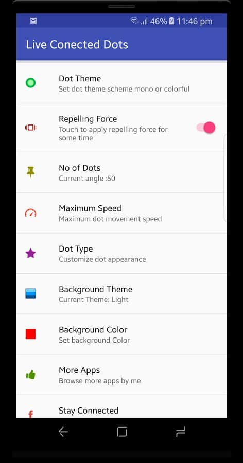 Connected Dots - Digital Net Live Wallpaper – увлекательные живые обои на андроид, где вы сможете наблюдать на своем экране многочисленные точки соединенные между собой связями. Установив эти животе обои на свой телефон или планшет вы сможете смотреть за точками которые перемещаются по экрану и если они находятся очень близко друг к другу то является связь. Заходите в настройки и меняйте цвет, размер точек и их количество, а также меняйте их скорость. Также обои порадуют вас многочисленными и разнообразными фонами и не займут у вас много места в телефоне. Устанавливайте и наблюдайте за хаотичным передвижением точек по экрану.
