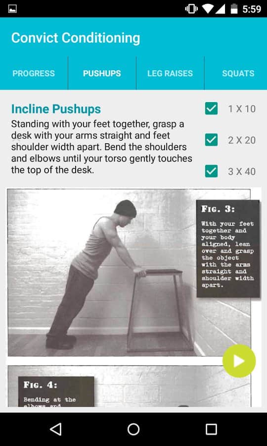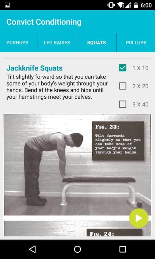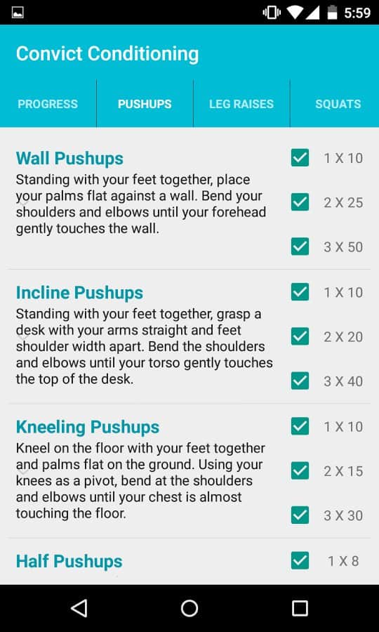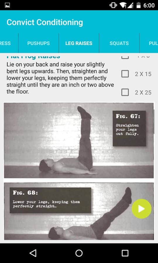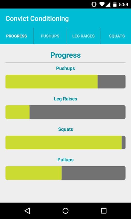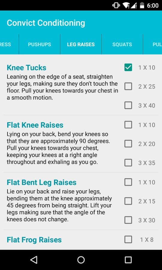 Convict Conditioning - Это можно было бы принять за обычную напоминалку если бы не её уникальные функции. С её помощью вы сможете следить за состоянием своих тренировок, а выполняя их отмечать свой результат. Так же здесь есть несколько графиков прогресса если вы качаетесь и следите за всеми своими группами мышц отдельно. Это приложение весьма уникально и имеет более широкий функционал по сравнению с обычными напоминалками.