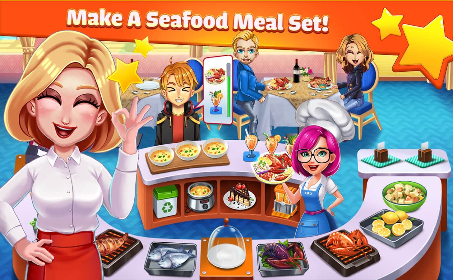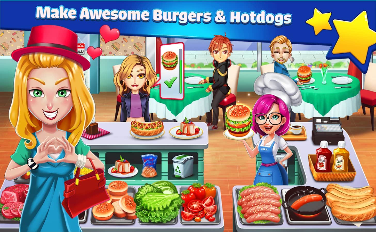 Cooking Idol - A Chef Restaurant Cooking Game – увлекательная игра на андроид, где вы будете выступать в роли повара. Станьте гениальным шеф-поваром и готовьте разнообразные блюда для голодных клиентов в своем ресторане быстрого питания. Принимайте заказы посетителей и готовьте вкусную и быструю еду такую как: чизбургеры, хот-доги, жареный картофель, чипсы, кексы и другие вкусные угощения. Делайте все как можно быстрее и не заставляйте своих посетителей долго ожидать своих заказов. Получайте чаевые и расширяйте и улучшайте свой ресторан.