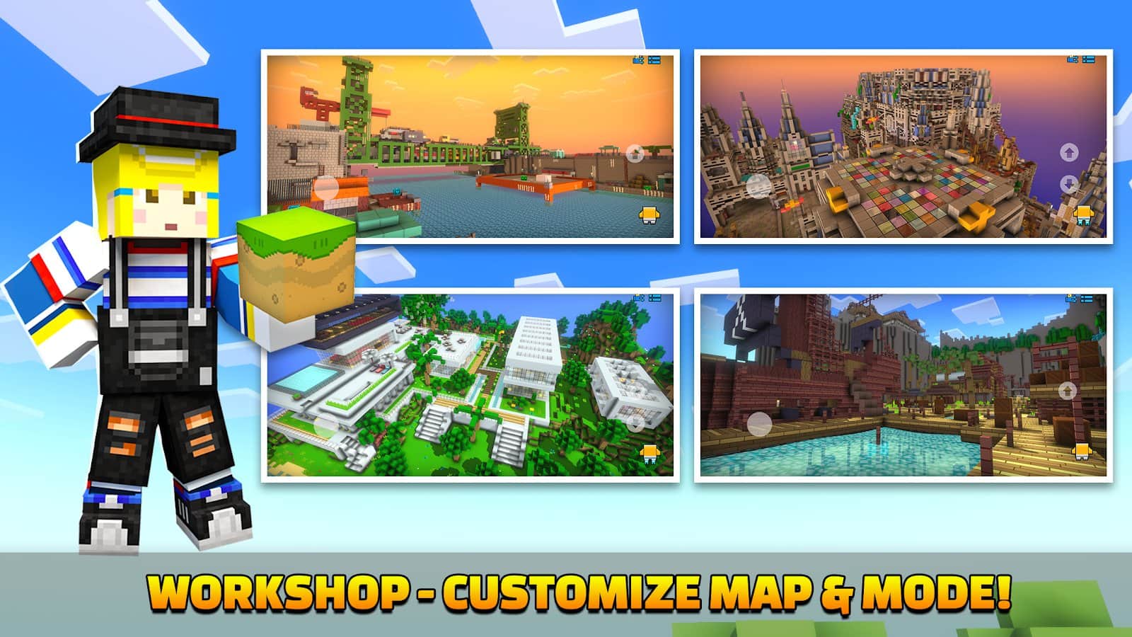 Cops N Robbers:Pixel Craft Gun - Делайте все, что хотите: перестреливайтесь с другими на выживание, создавайте новые карты используя доступные блоки, пробуйте играть в различных режимах и берите в руки персонализированное оружие, а также дополнительное сооружение! Более 20 карт, 250 видов оружия, 10 наборов доспехов («Санта-Клаус», «Тесла», «Пряничный набор», «Конфетный мальчик/девочка», «Ястреб», «Тесла»), интересные скины для персонажей и самостоятельное создание пушек или скинов. Активируйте все специальные эффекты и побеждайте на поле битвы!