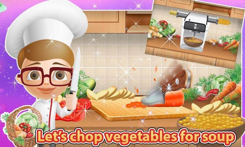 Corn Soup Maker Story – увлекательная игра для детей где они окажутся на кухне в качестве шеф-повара и будут варить вкусный кукурузный суп. В вашем городе открыли новый ресторан, где вы сможете побывать в роли шеф-повара и приготовить вкусный суп. В обязанности шеф-повара входит поход по магазинам, чтобы найти самые вкусные и свежие продукты для своего блюда. Приобретайте овощи, сосиски и различные специи для приготовления супа. Для начала вам необходимо помыть и нарезать все ингредиенты на мелкие кусочки. Налить в кастрюлю воды и как только вода закипит бросить туда все овощи, сосиски и специи. Отличная игра для детей, которая даст им полное понимание работы на кухне.
