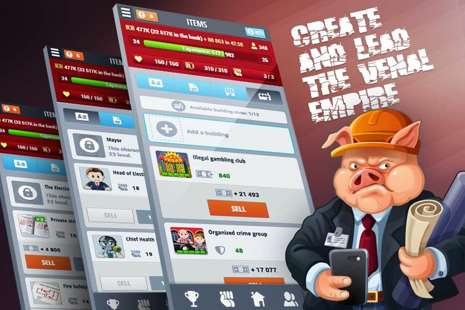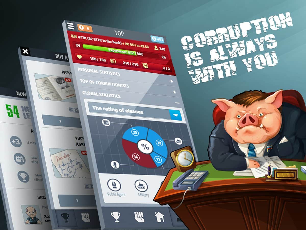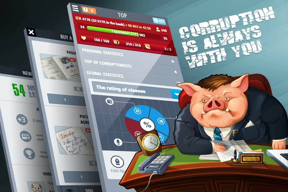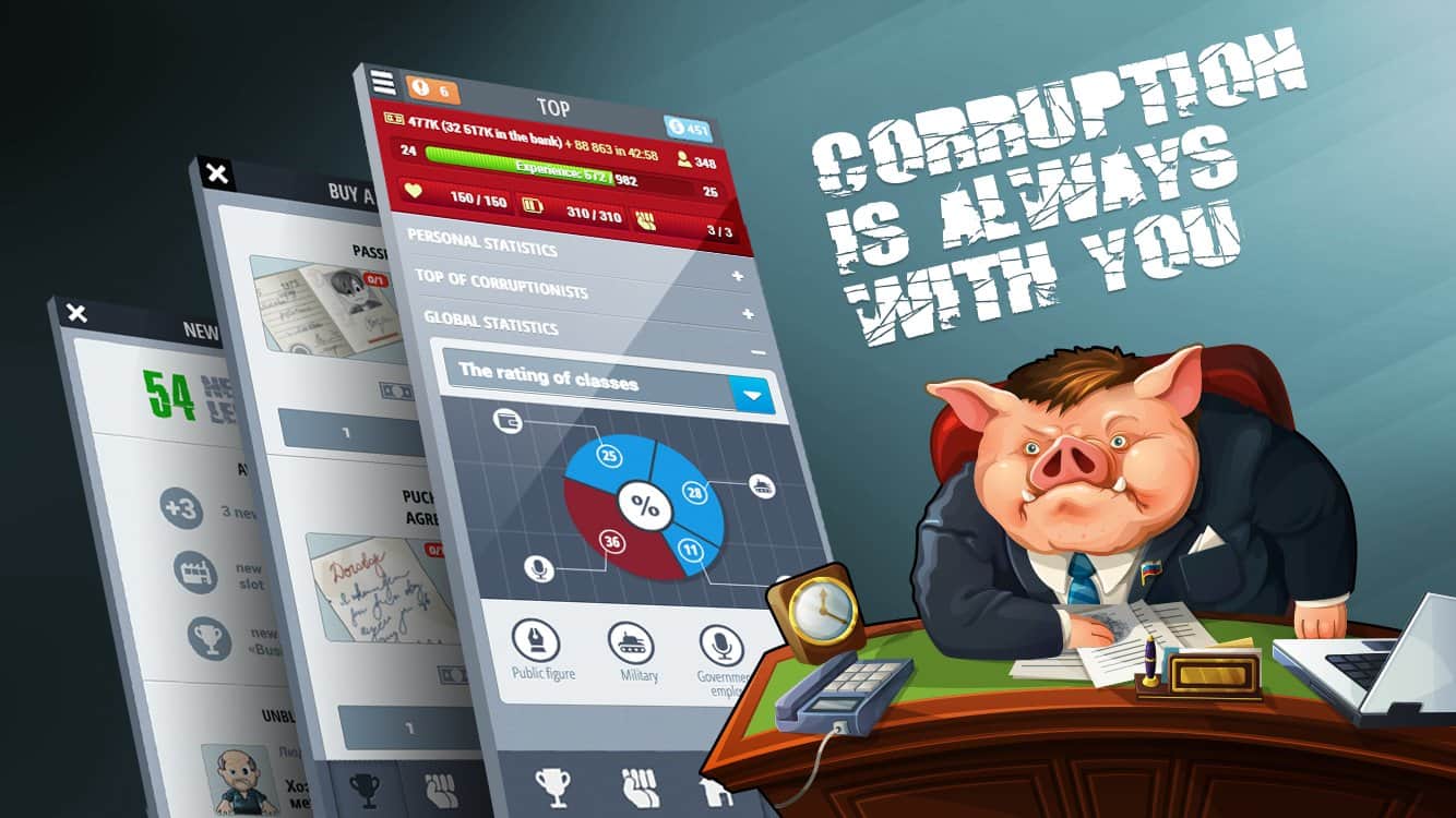 Corruption – экономическая стратегия на андроид, в которой вы сможете построить свою продажную корпорацию. С помощью этой игры вы попадете в мир, где все продается и покупается. В этой игре вы окажитесь в роли честного чиновника, который не берет взятки. Но мир так устроен, что ему волей неволей предстоит встать на скользкую дорожку и научиться находить нужные связи, наезжать на конкурентов и поддастся огромному соблазну и взять взятку. Проследите в этой игре путь простого и бесхитростного чиновника, который на глазах будет превращаться в коррумпированного и хитрого чиновника, которому будет мало всего, и он будет требовать добавки денег.