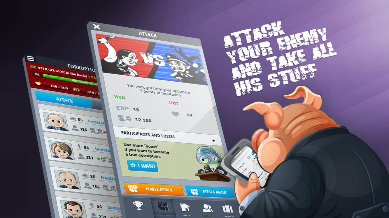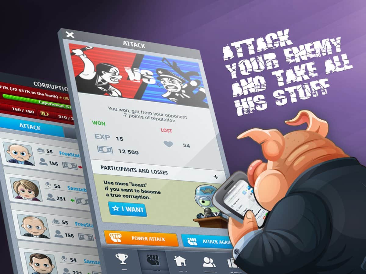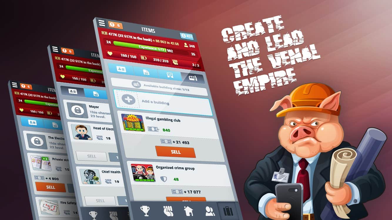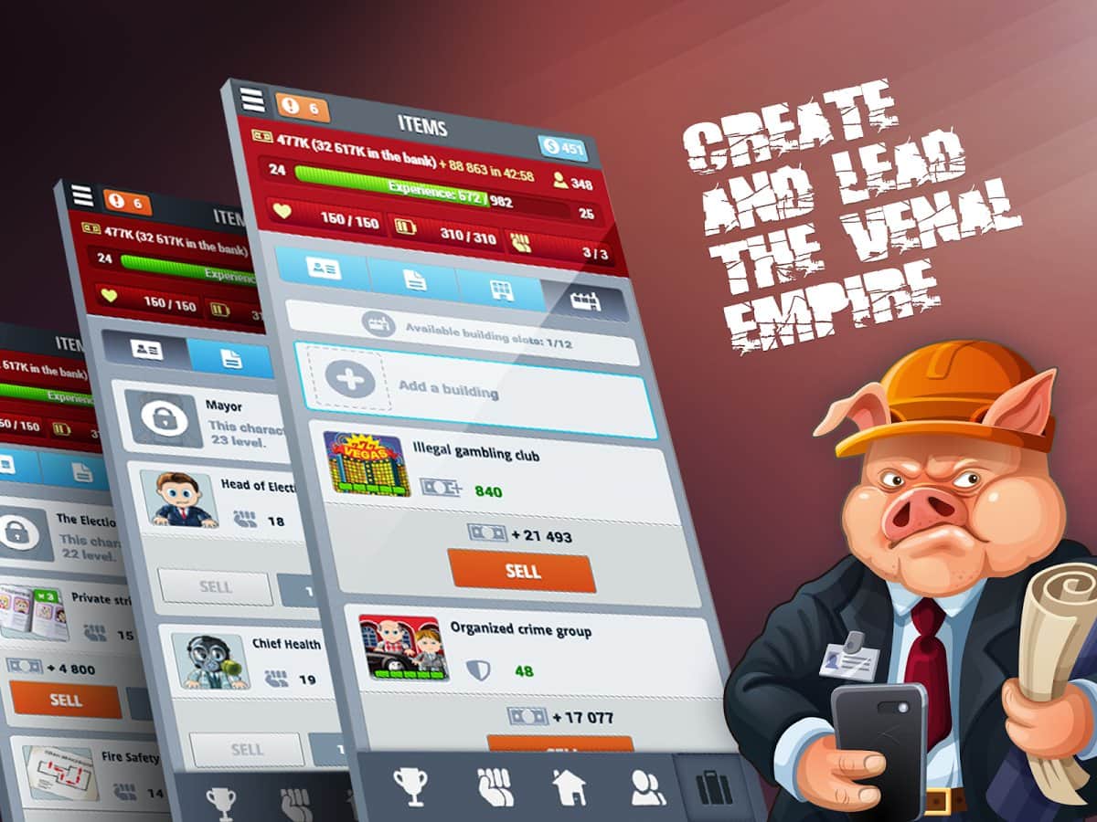 Corruption – экономическая стратегия на андроид, в которой вы сможете построить свою продажную корпорацию. С помощью этой игры вы попадете в мир, где все продается и покупается. В этой игре вы окажитесь в роли честного чиновника, который не берет взятки. Но мир так устроен, что ему волей неволей предстоит встать на скользкую дорожку и научиться находить нужные связи, наезжать на конкурентов и поддастся огромному соблазну и взять взятку. Проследите в этой игре путь простого и бесхитростного чиновника, который на глазах будет превращаться в коррумпированного и хитрого чиновника, которому будет мало всего, и он будет требовать добавки денег.