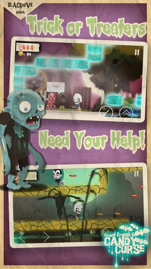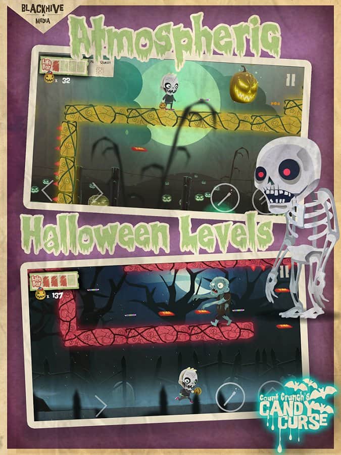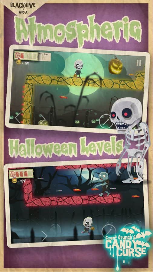 Count Crunch's Candy Curse – Отличный платформер выполненный специально под праздник Хэллоуин. Хотя играть в неё можно и в любое другое время, от этого игрушка хуже не станет. Управлять вам предстоит мальчиком в жуткой маске скелета. Бегаем по различным уровням, собираем конфетки и сладости. Закидаем чем-то зелёном монстров попадающихся у вас на пути. Будьте предельно осторожны, в игре есть различные опасные ловушки, рвы с шипами и многое другое. Особая радость наступает когда вы доберётесь до своей заветной мечты – карманной игровой приставки. Собирайте наклейки и получайте различные бонусы.