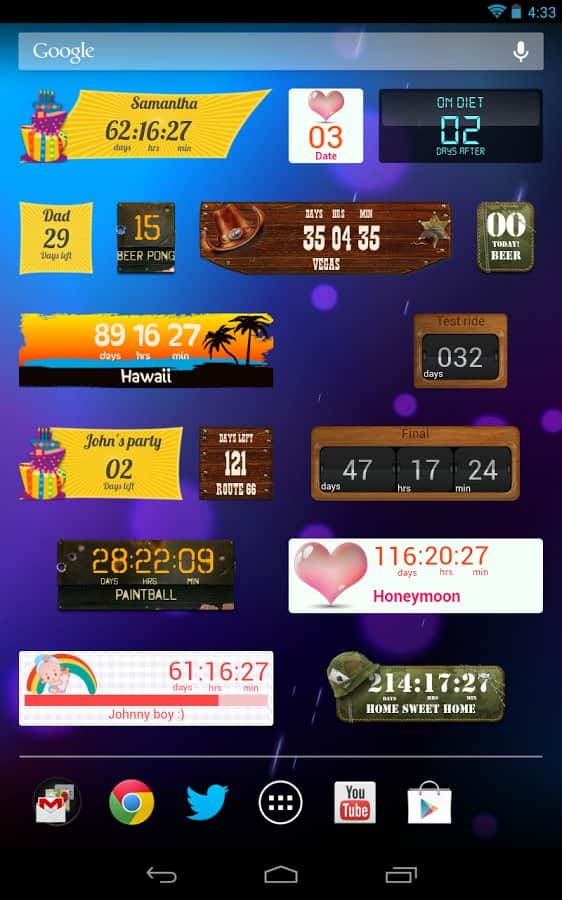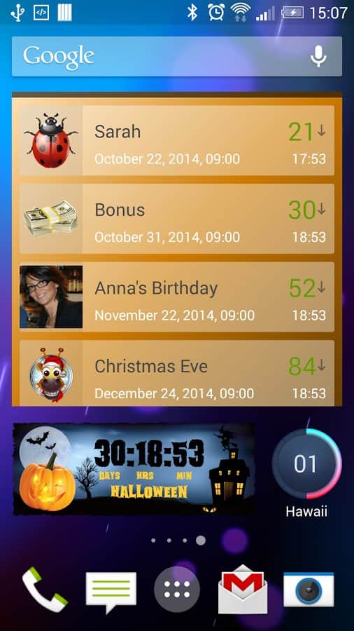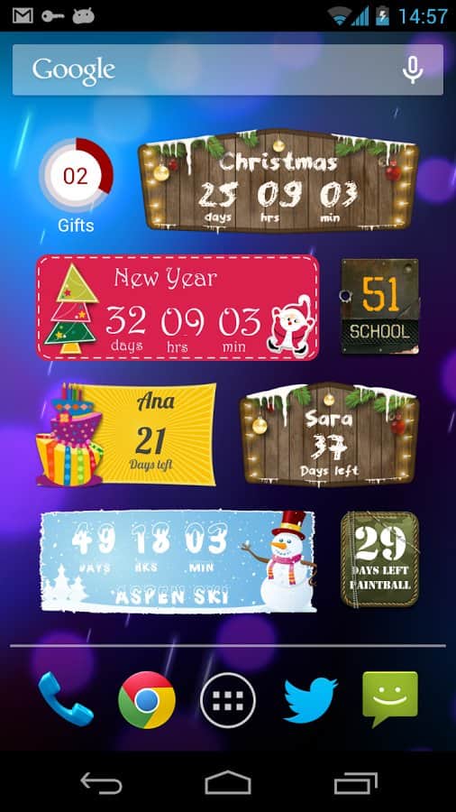 Countdown Widget / Обратный отсчет виджет - отличная идея виджета обратного отсчета для вашего андроид устройства от разработчика SMSROBOT LTD. Теперь вы не пропустите знаменательные даты своей семьи, дни рождения родственников/друзей, а также многое другое значимое для вас. Настройте вручную количество дней до важного события и наблюдайте как уходит время, готовясь к событию. Красивые темы виджета, способность устанавливать более одной даты, возможность выбора одного из трех размеров виджета и многое другое с Countdown Widget.