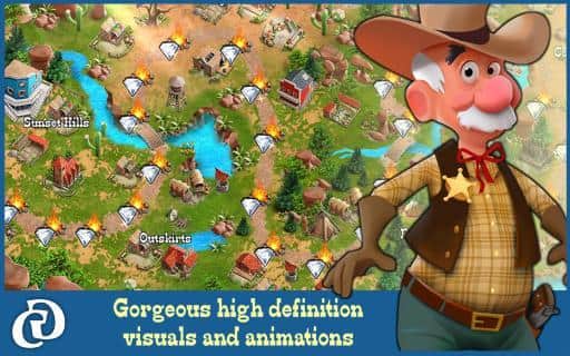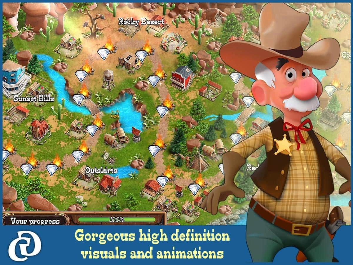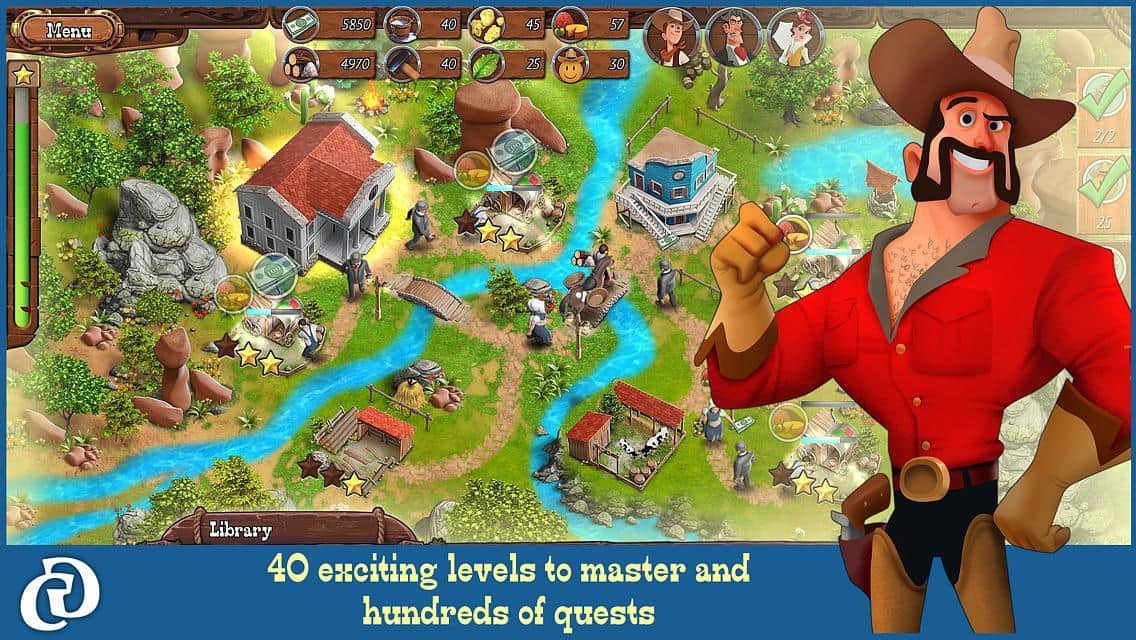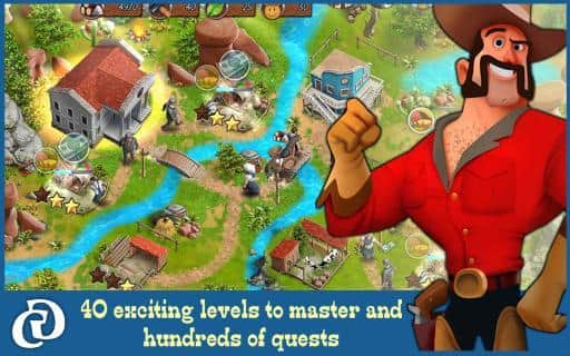 Country Tales (Full) - довольно популярная приключенческая игра, геймплей которой представляет из себя нечто среднее, между экономическим симулятором, ситибилдером, квестом, при этом используется казуальное управление, что заметно облегчает освоение. Всего вас ждет более 40 уровней, в трех режимах игры, десятки квестов и заданий и захватывающий приключенческий сюжет в сеттинге Дикого Запада. Теперь немного о сюжете. Как уже говорилось события разворачиваются на Диком Западе, главным героем истории станет молодой человек по имени Тэд, который после окончания обучения решает переехать из своей деревеньки, где он занимался фермерским хозяйством, в более крупный город. В городке под звучным названием Sunset Hills наш герой встречает девушку, с этого момента и начинает развиваться основной сюжет.