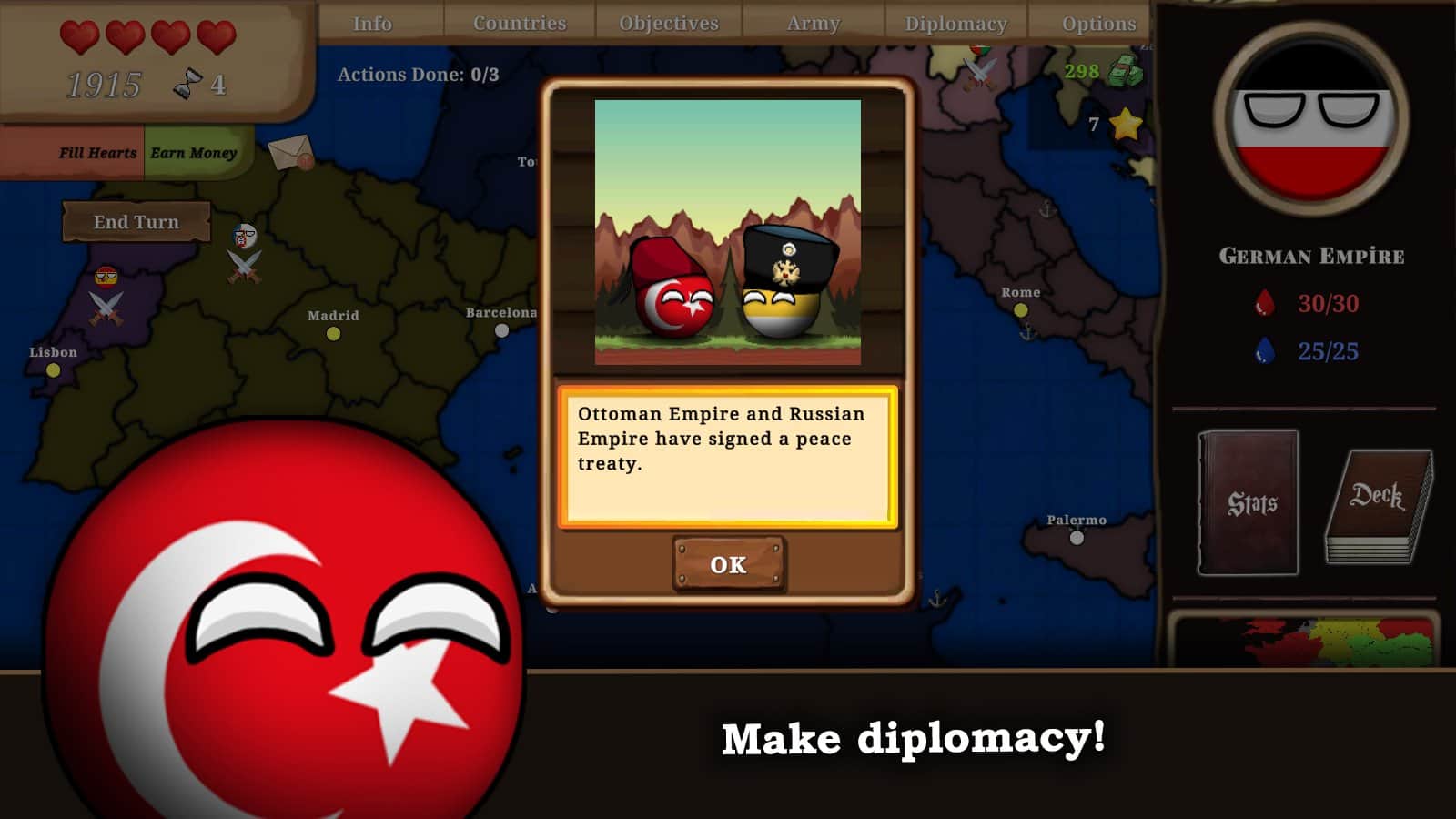 Countryball: Europe 1890 - это захватывающая стратегическая игра, объединяющая пошаговую боевую механику, использование карт и статистики. В игре вам предстоит начать с выбора режима - кампанию или завоевание, а также вашего персонажа. Затем попытайтесь выполнить поставленные задачи, захватывая территории и подчиняя через дипломатические маневры. Вы можете объявлять войну, заключать союзы, манипулировать слабыми странами, удалять союзников или аннексировать свои подконтрольные государства. Перед каждым сражением вы можете призвать своих союзников и подконтрольные государства, чтобы они присоединились к битве на вашей стороне. Хотя союзники иногда откажутся от вашего призыва, ваши подопечные государства всегда будут поддерживать вас в битвах.