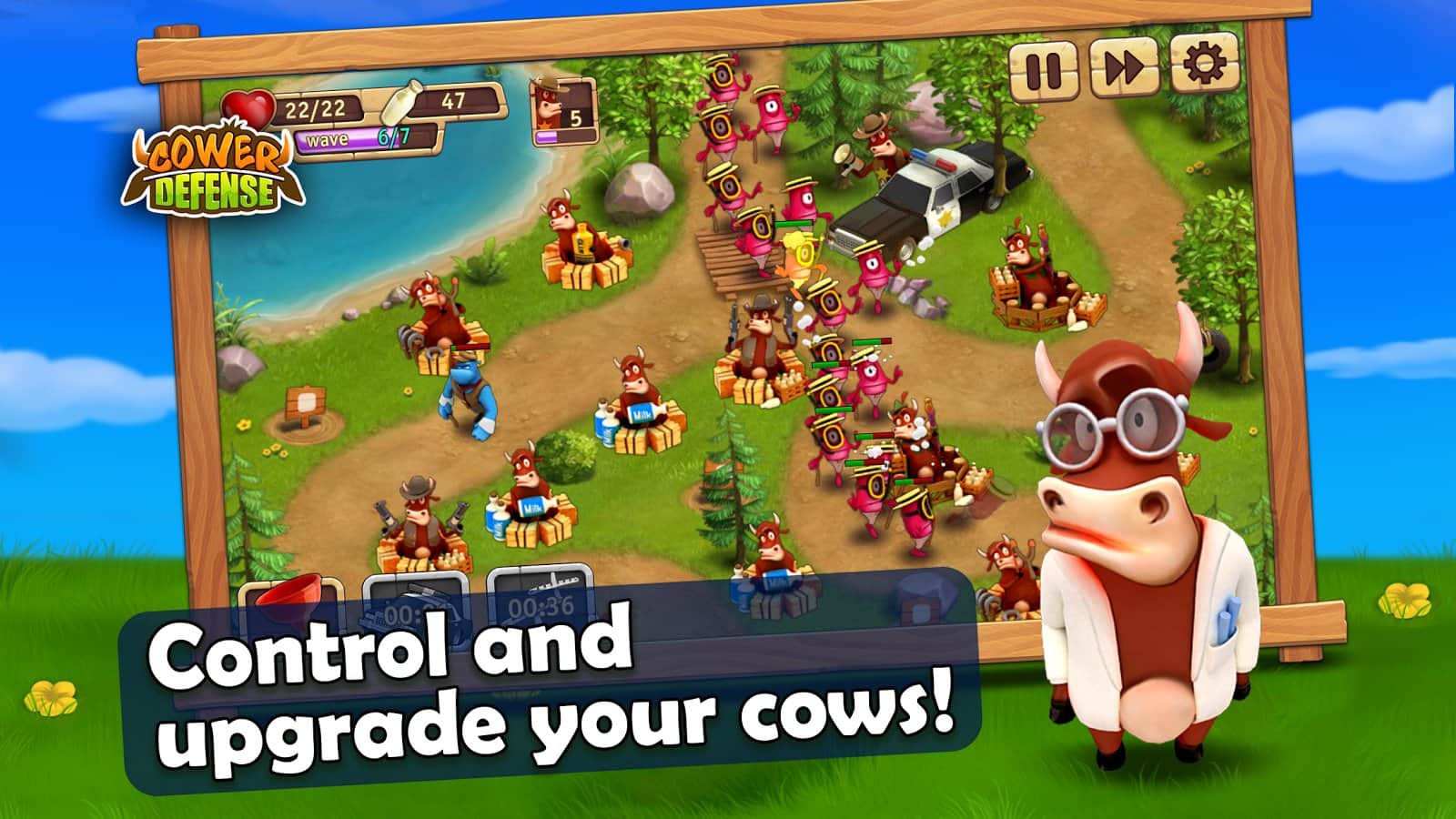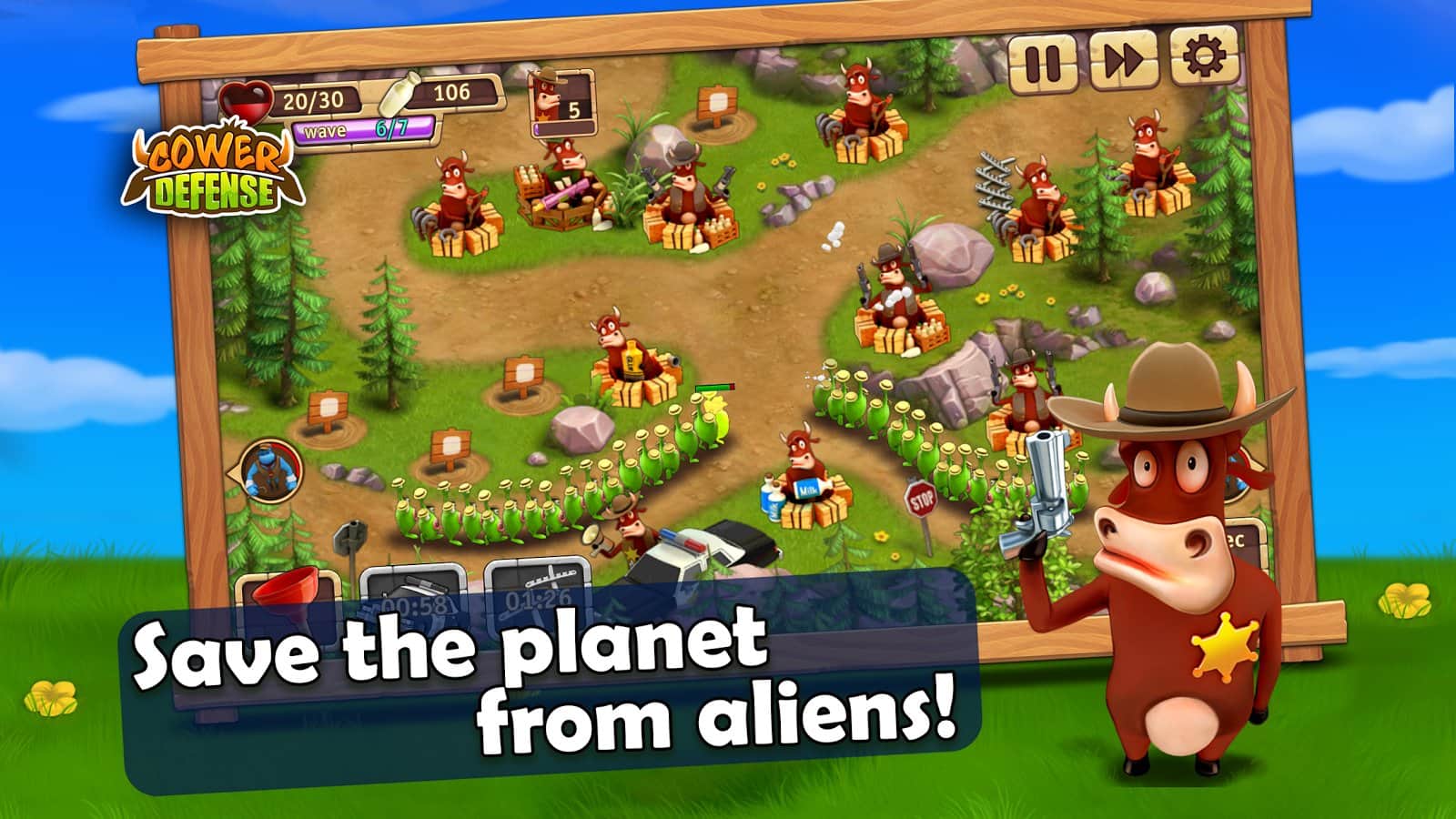 Cower Defense - тактическая стратегия из серии оборона башен в которой разработчики решили реализовать довольно необычный сюжет. По стечению обстоятельств ферма осталась без присмотра, а вернее единственные кто остался на ней это стадо коров. Пролетающие мимо инопланетяне решили захватить ни в чем не повинных буренок, но не тут - то было, рогатые решили дать пришельцам отпор. Захватчики конечно такого поворота не ожидали, но попыток не оставили. Игра предоставит вам возможность опробовать свои силы во множестве различных режимов, а так же десятки карт для реализации ваших тактических способностей. К тому же режим боя не единственное что вам предстоит делать, необходимо еще и расширять, развивать базу, ну вы поняли, ферму дабы изучать новые умения.