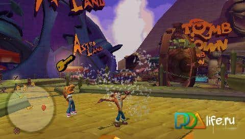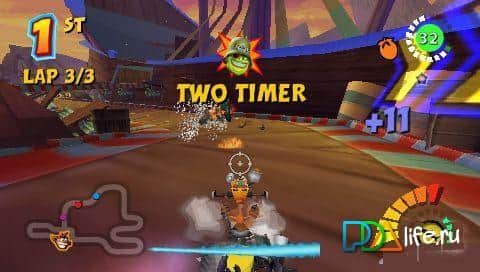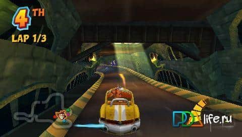 Crash Tag Team Racing - мультяшные гонки для PSP - неутомимый герой - лисенок Краш снова попадает в переделку. Чтобы выжить в безобидной на первый взгляд гонке, вам предстоит приложить немалые усилия! Здесь нет правил, каждое авто имеет свой заряд пушек и пулеметов и готов дать отпор всем, кто встанет на пути! И если скорость не ваш конек, то оружие вам всегда пригодится, особенно для обгоняющих соперников! Ну а если, вдруг, у вас затекли ноги, - не беда, вы всегда сможете выйти из авто и пройтись пешочком! Это поможет запастись новыми запчастями, найти скрытые трассы, а также разрушить пару-тройку построек - а вдруг там что-то интересное!