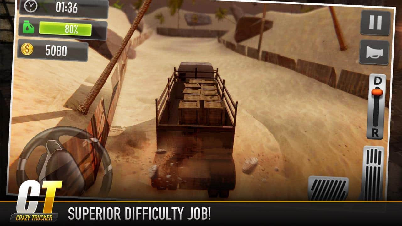 Crazy Trucker – симулятор на андроид, где вы возьмете под свой контроль грузовик и будете перевозить грузы по различным трассам. В этой игре вы будете вести свой грузовик по бездорожью, и стараться пройти трассу с минимальными потерями. С каждым новым уровнем сложность игры будет увеличиваться и вам придется изрядно постараться, чтобы пройти все испытания. В игре вам придется столкнуться с различными погодными условиями, а также проехать по пустыне и джунглям. Отправляйтесь в опасное путешествие и открывайте для себя новые грузы и трассы, проходя все миссии игры.