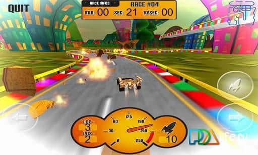 Визуально игра выглядит классно, но само управление в этой игре оставляет желать лучшего, ты только и делаешь что носишься по трассе сбиваю коробки на своем пути и собираешь пауверапы с ракетами обгоняя противников (которых кстати даже при таком тупом управлении в котором постаянно врезаешься во все подряд пытаясь хоть как то маневрировать, их не состовляет труда обогнать)