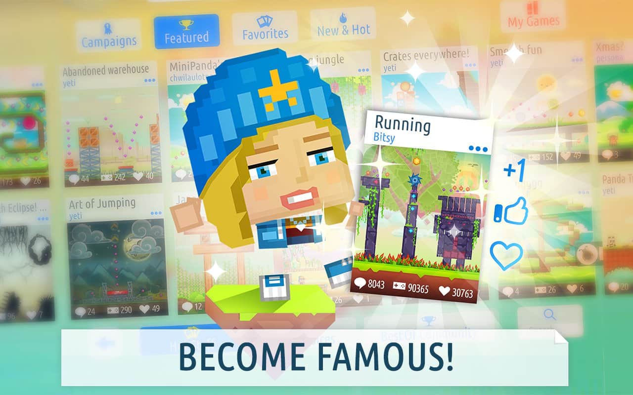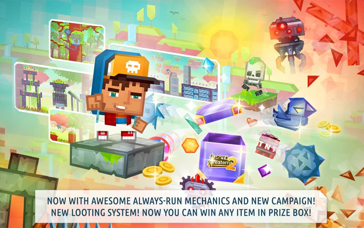 Createrria 2 craft your games! – отличная игра-инструмент, который предоставляет вам возможность создавать самому свои игры всего за несколько минут и делиться ими с друзьями. Ни каких навыков программиста или художника вам не надо. Все необходимые инструменты у вас перед глазами. Хотите поиграть в что-то подобное angry Bird? Тогда медведь-каскадёр к вашим услугам, достаём рогатку и стреляем… Уровни можно создавать с различных материалов и пусть игроки их разрушают просто до основания. Создать интересный платформер тоже не проблема. Всего несколько минут и уровень готов.