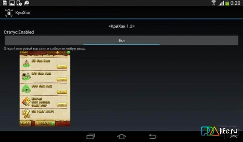 CreeHack (КриХак) - Великолепное приложение для взлома множества различных игр на андроид. Самым примечательным является то что оно не требует наличия прав root доступа, которые так боятся получать множество пользователей. Конечно это приложение не может взломать любую игру, однако разработчики постоянно трудятся над данным вопросом и поднимают качество приложения в целом. Управлять приложением довольно просто, вам нужно всего-то его запустить а дальше выполнить покупку как в обычном игровом магазине, и если игра поддерживается, то вам сразу же зачислят ту игровую валюту.