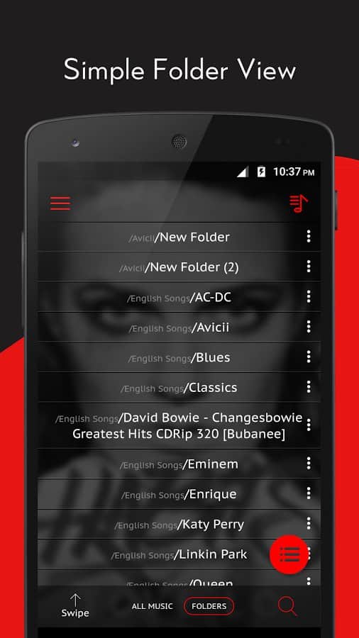 Crimson Music Player - MP3 - Не только простой но и очень качественный аудио плеер с множеством различных функций. Этот проигрыватель был сделан в красивом красном стиле и сможет порадовать вас не только своим внешним видом но и всеми функциями что к нему прилагаются. И хотя большинство из них довольно стандартные такие как эквалайзер и сортировка списков все же выполнены они просто великолепно. Да и к тому же сам интерфейс плеера довольно приятный и компактный.