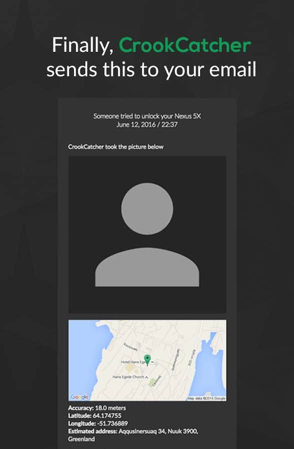 CrookCatcher - Anti Theft – хорошее приложение от разработчика Jakob S. Harteg, цель которого информировать собственника телефона в случае неправильной попытки разблокировать экран устройства. На электронную почту вам будут автоматически отправлены фото злоумышленника и GPS координаты нахождения гаджета. Единственное НО, это наличие фронтальной камеры устройства.