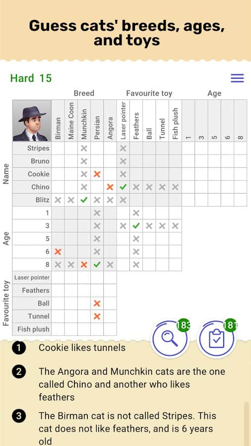 Логика заставляет ваш мозг работать на максимуме, чтобы было намного легче в будущем находить скрытые подсказки и решать целые головоломки, непосильны другим из-за высокого уровня сложности. Используйте все найденные ключи для поиска разгадки, проходите уровни и совершенствуйте свой ум с каждым разом, успешно побеждая в играх. Следуйте представленным подсказкам в сюжете каждой головоломки и будьте готовы к непосильным задачам, к каким необходимо подготовиться и тщательно обдумать все пути решения.