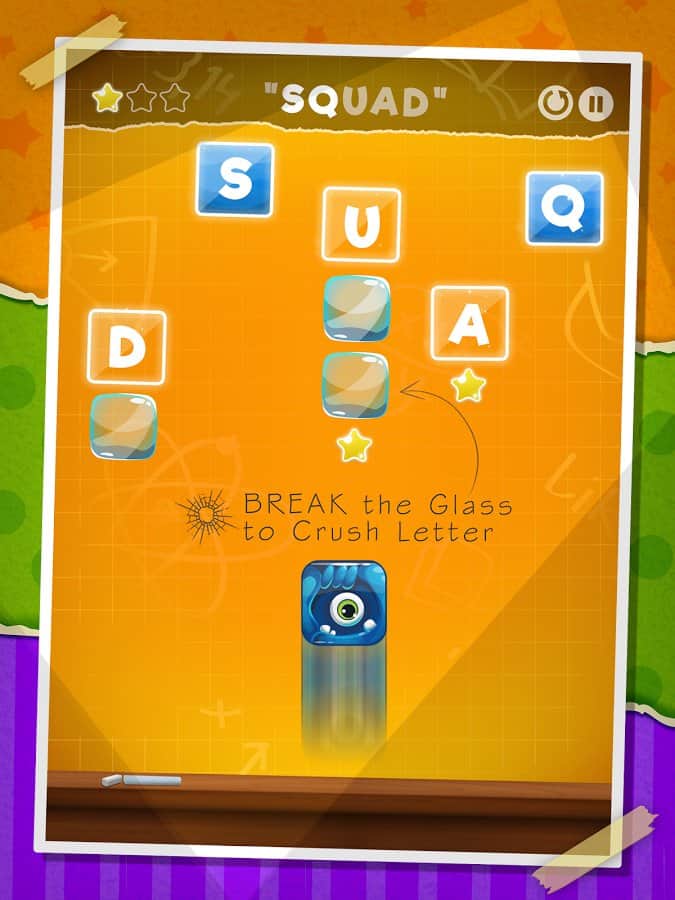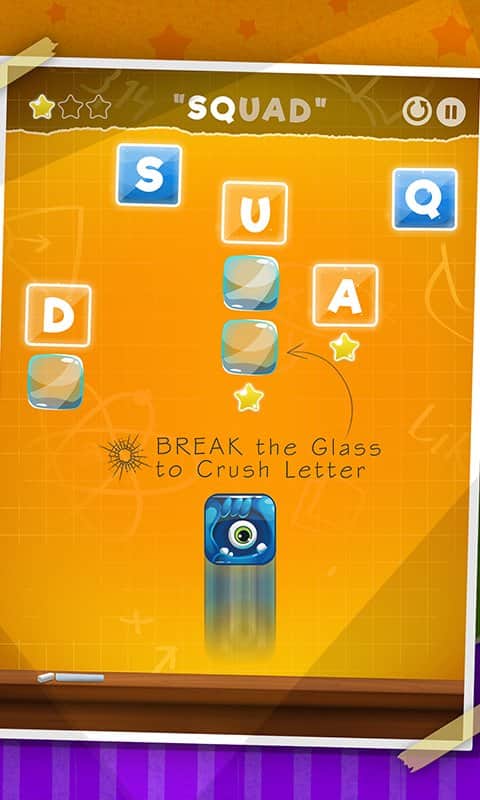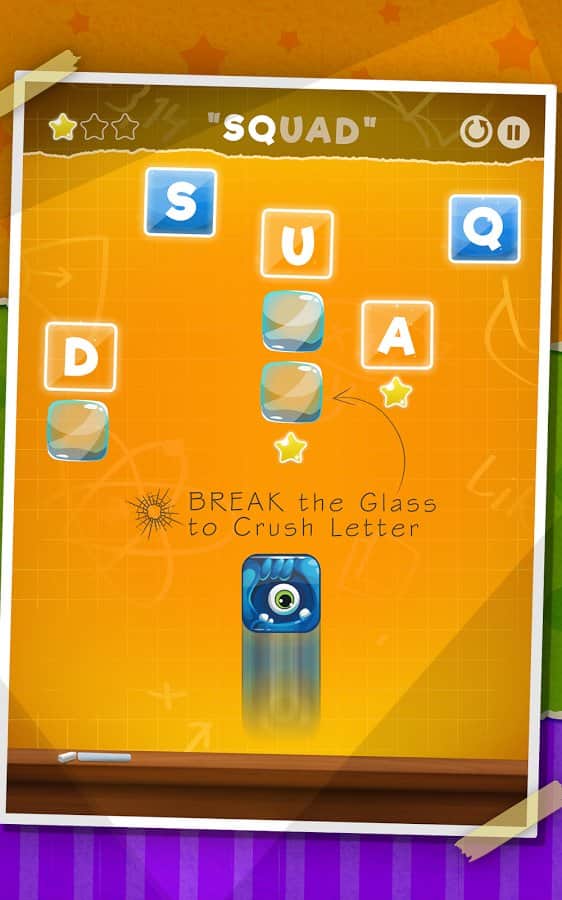 Crush Words – увлекательная игра на андроид, где вы будете составлять слова из букв. В этой игре вы будете управлять блоком, который перемещается по нижней части экрана и стреляет по буквам. Вашей задачей составить слово из букв находящихся на игровом поле, в определенной последовательности стреляя по буквам. Не путайте последовательность букв и метко совершайте выстрелы. Обходите многочисленные преграды и ловушки у себя на пути и не допускайте столкновения с ненужными блоками. С каждым новым уровнем сложность игры будет увеличиваться, добавляя движущиеся преграды. Учите новые слова и прибегайте к помощи встроенного словаря.