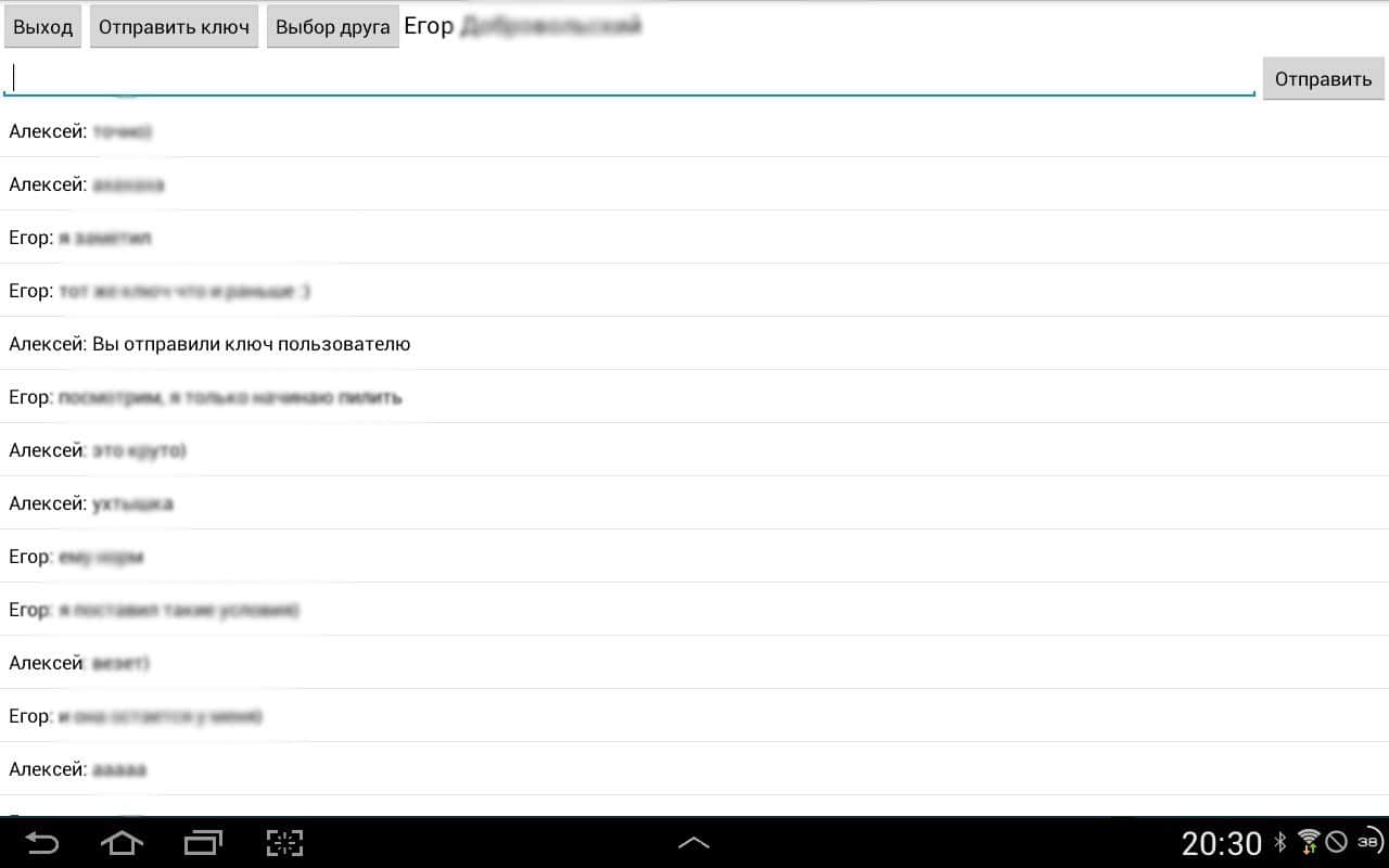 Обменяйтесь с собеседником ключами, нажатием на кнопку с обеих сторон "Отправить ключ";