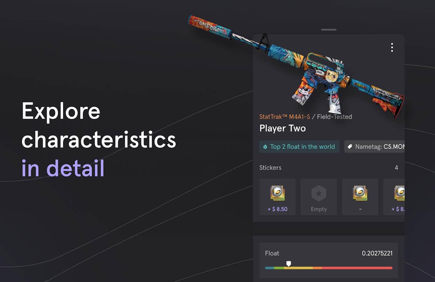 CS.MONEY ‒ Обмен скинов CS:GO - CS:GO невозможно представить без открытия кейсов с ценными призами, это приложение разработано подобным симулятором. Страница с доступными кейсами, инвентарь, магазин, меню с играми, краш в виде ставок денег, апгрейдер с разными скинами и рисками, монетка на выигрыш или проигрыш драгоценных ресурсов, рулетка, контракты, дерево с технологиями, викторина на знание скинов. Получайте опыт, копите деньги на балансе, собирайте легендарные вещи, повышайте ранг и наслаждайтесь интересным времяпровождением!