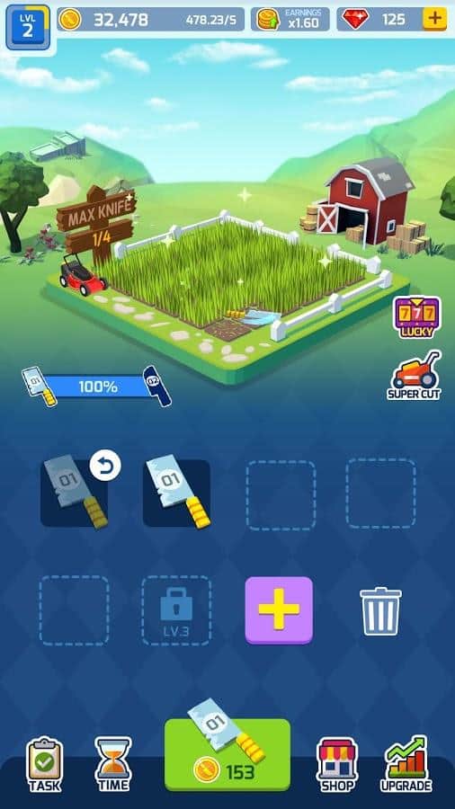 Cut the Grass – увлекательная игра на андроид, где вы будете стричь газоны. Трава на вашем газоне растет с молниеносной скоростью и вам не чего не остается как взять в руки газонокосилку и подстричь газон. В этой игре для лучшего результата вам предстоит объединять ножи, топоры и газонокосилки для достижения наилучшего результата. Собирайте монетки кося траву у себя на газоне, объединяйте между собой два одинаковых предмета и получайте совершенно новые. Эта игра порадует игроков быстрым, легким и увлекательным игровым процессом с элементами кликера. Соберите свою неповторимую коллекцию ножей и машин для стрижки газонов.