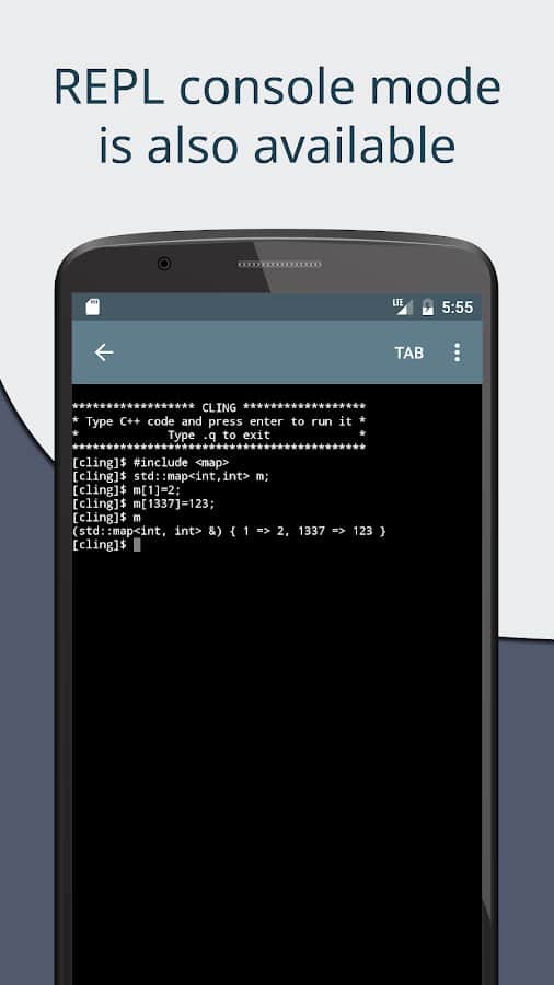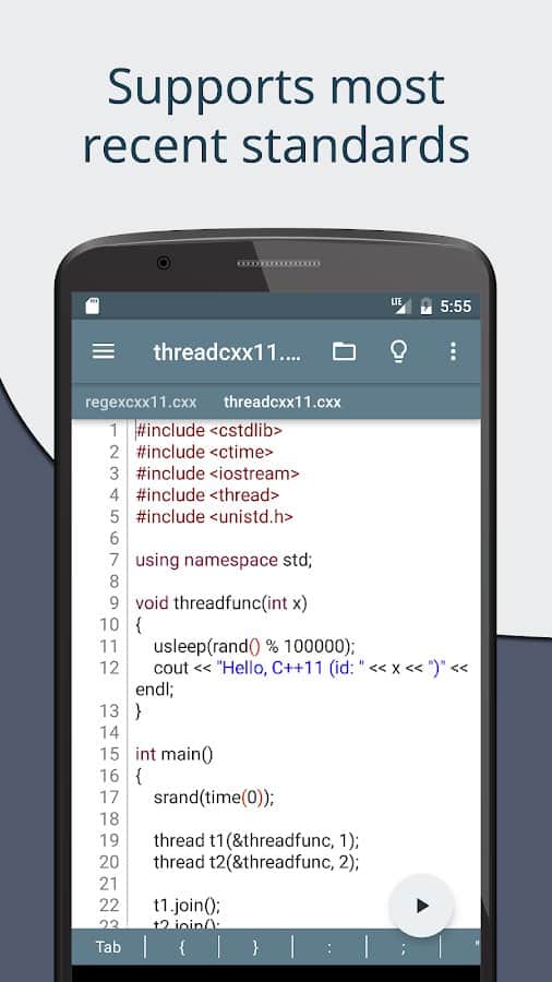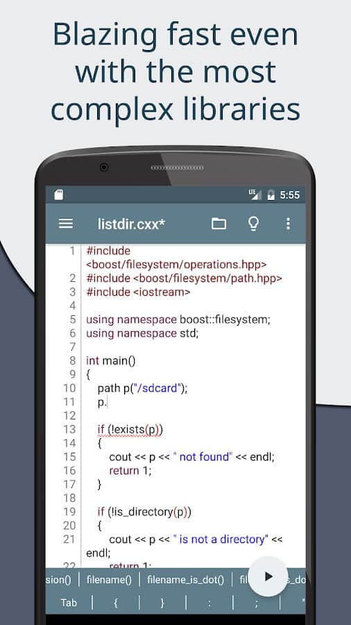 Cxxdroid - C/C++ compiler IDE - Легко и быстро обучайтесь навыкам использования языка C и C++ ан вашем мобильном девайсе. Внутри приложения у вас уже будут все, что необходимо для работы: Boost, SQLite, ncurses, libcurl, SDL2, SFML, Allegro, прочее. Функции, доступные в реальном времени, могут еще не раз пригодиться вам в работе, так как есть возможность автоматически прогнозировать отступ и проводить детальные анализы кода, словно в настоящем IDE. Основная особенность заключается в том, что вам будет доступна большая панель клавиатуры с нужными символами для программирования на C++.