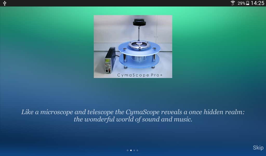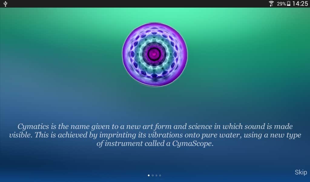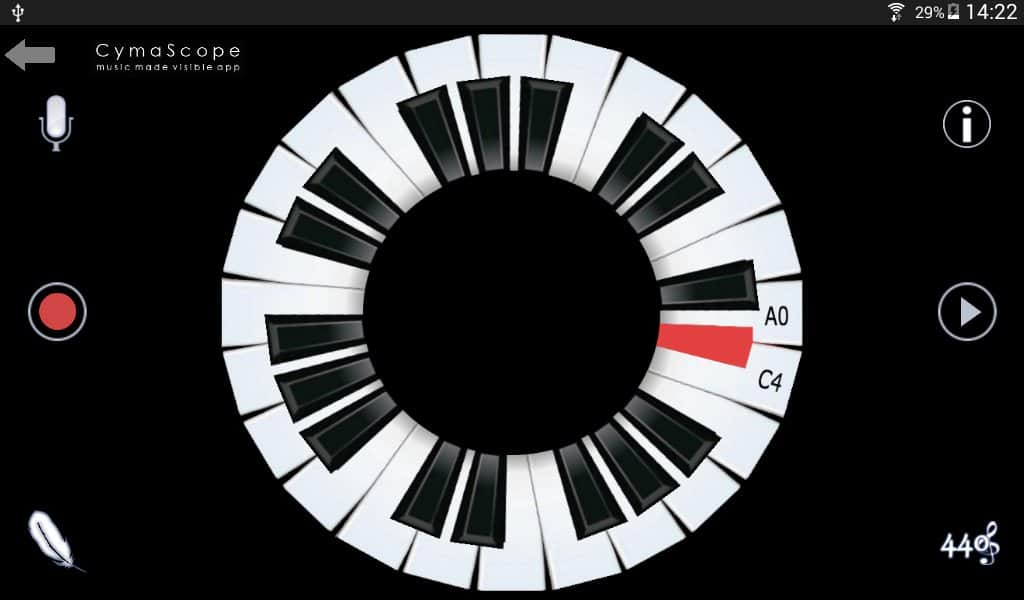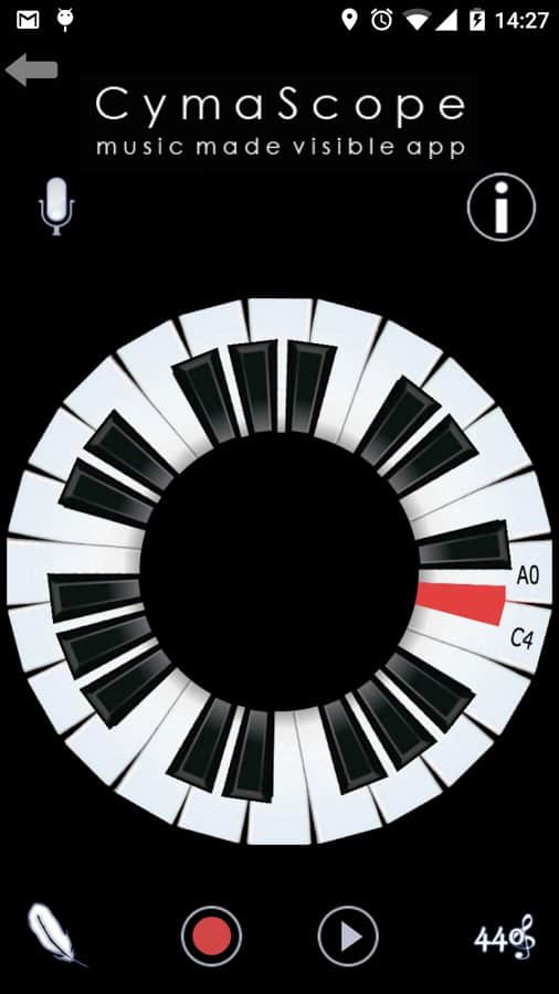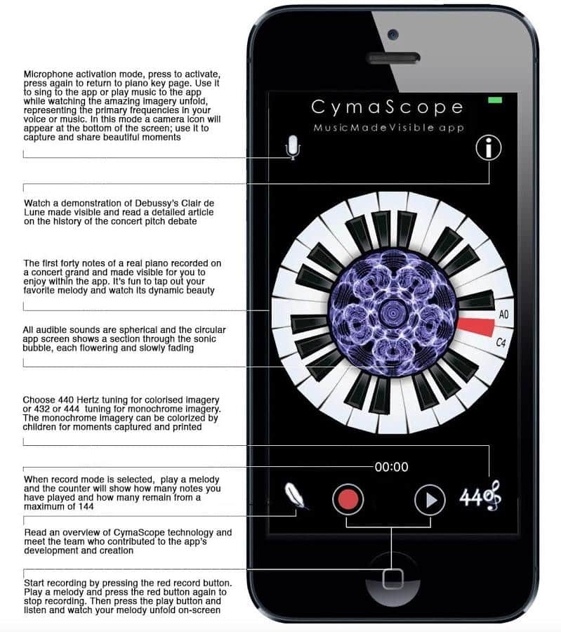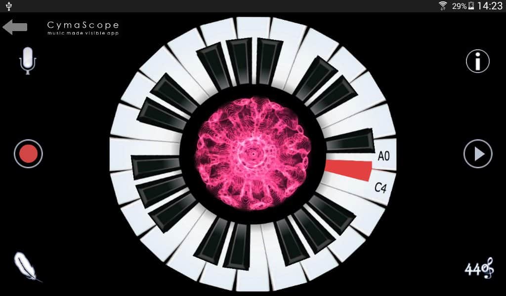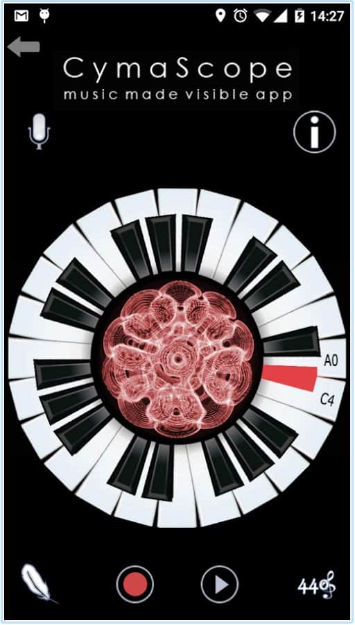 CymaScope - Music Made Visible - Делайте свою музыку видимой! С помощью этого приложения, в то время как вы будете играть на пианино ваша музыка будет отображаться по центру экрана. Работает это очень просто, для определенной ноты задан определенный цвет и форма. И когда вы играете они быстро меняются составляя собой забавную картину из множества цветов.