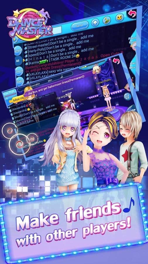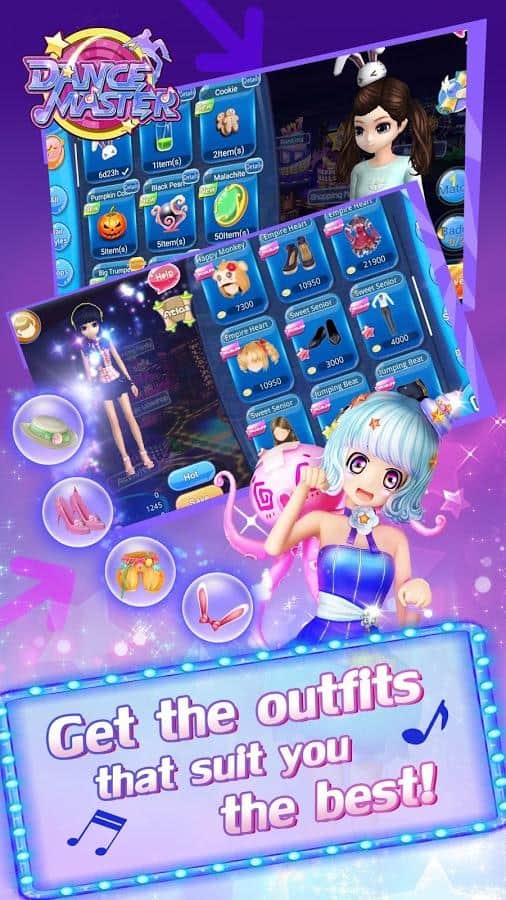 Dance Master – увлекательная музыкальная игра на андроид, созданная в стиле аниме. В этой игре вы сможете выбрать себе персонажа из представленных в игре и одеть его по своему усмотрению. Начинайте играть в эту игру и двигайте в ритм музыки, выполняя разнообразные танцевальные движения. Танцуйте со своими фантастическими друзьями и вместе весело проводите время. Вашей главной задачей будет танцевать под меняющуюся музыку и набирать максимальное количество очков, попадая в такт. Одевайте своих героев в разных стилях и получайте максимум удовольствия от игры. Общайтесь с другими игроками в общем чате и сочиняйте новые танцы.