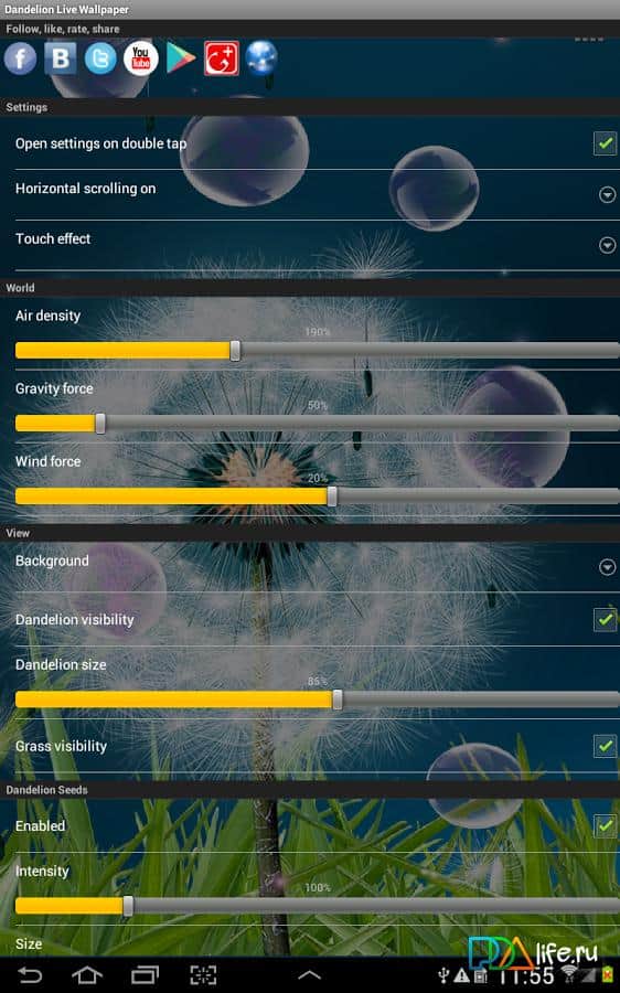 Dandelion Live Wallpaper – милые обои с одуванчиками, семена которых легкий ветерок разносит по экрану вашего андрод устройства. Обои содержат большое количество настроек, эффектов и анимации. Также стоит отметить, что данные обои весьма экономичны в расходовании заряда аккумулятора вашего устройства.