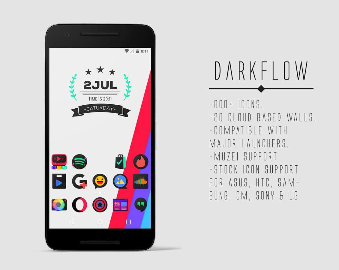 DarkFlow - Icon Pack - Набор красивых иконок для любителей ярких цветов, и их сочетания. Этот набор весьма просто но своеобразен, здесь вы найдете соединение самых различных цветов, это в буквальном смысле эксперимент с иконками и их цветами. Самые яркие цвета будут подчеркнуты и выделены, и на фоне вашего рабочего стола будут смотреться просто шикарно. Так же стоит заметить что иконок здесь более 800 штук, и идут они в наборе с 20 уникальными и качественными HD обоями.