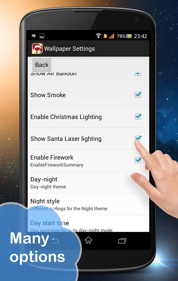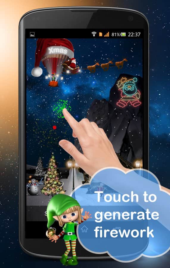Day Night Xmas LWP 2015 – Скоро новы гож и Рождество. Надеемся, что эти новогодние живые обои понравится многим. С момента появления живых обоев на Android, прошло много времени а они только набирают свою популярность. Мощности современных процессоров хватает для того чтобы ваш рабочий стол не притормаживал даже с живыми обоями. Живые обои реагируют на касание, в том месте, где вы дотронулись будет яркий и красочный фейерверк. Можно установить счётчик обратного отчёта и наложить интересные цветовые решения. В живых обоях есть возможность менять сцены с дневной на ночную.