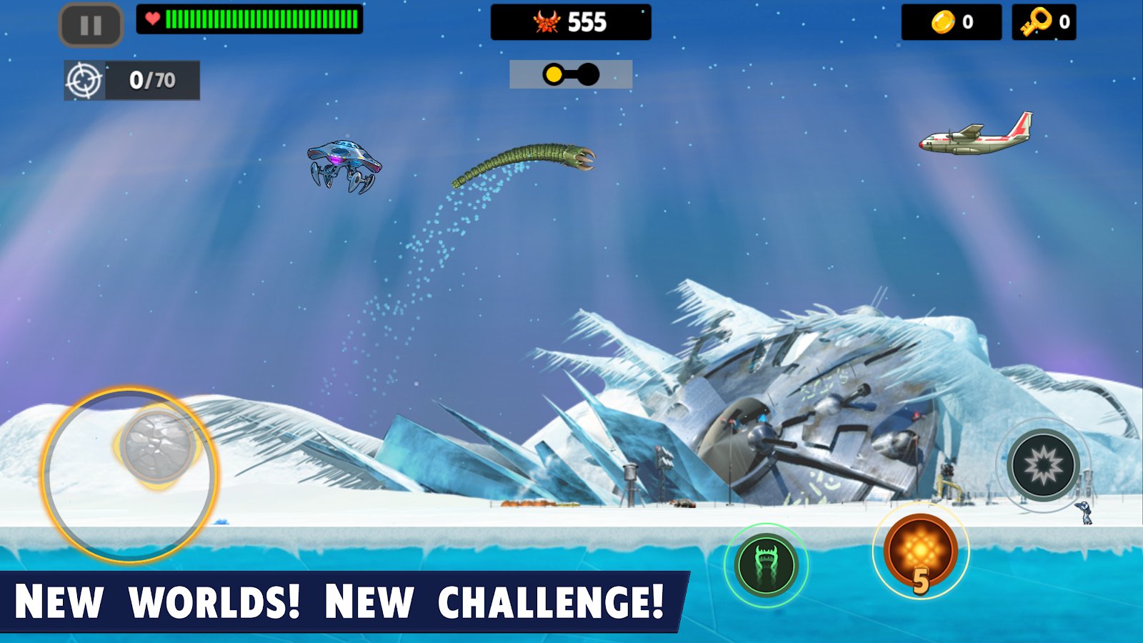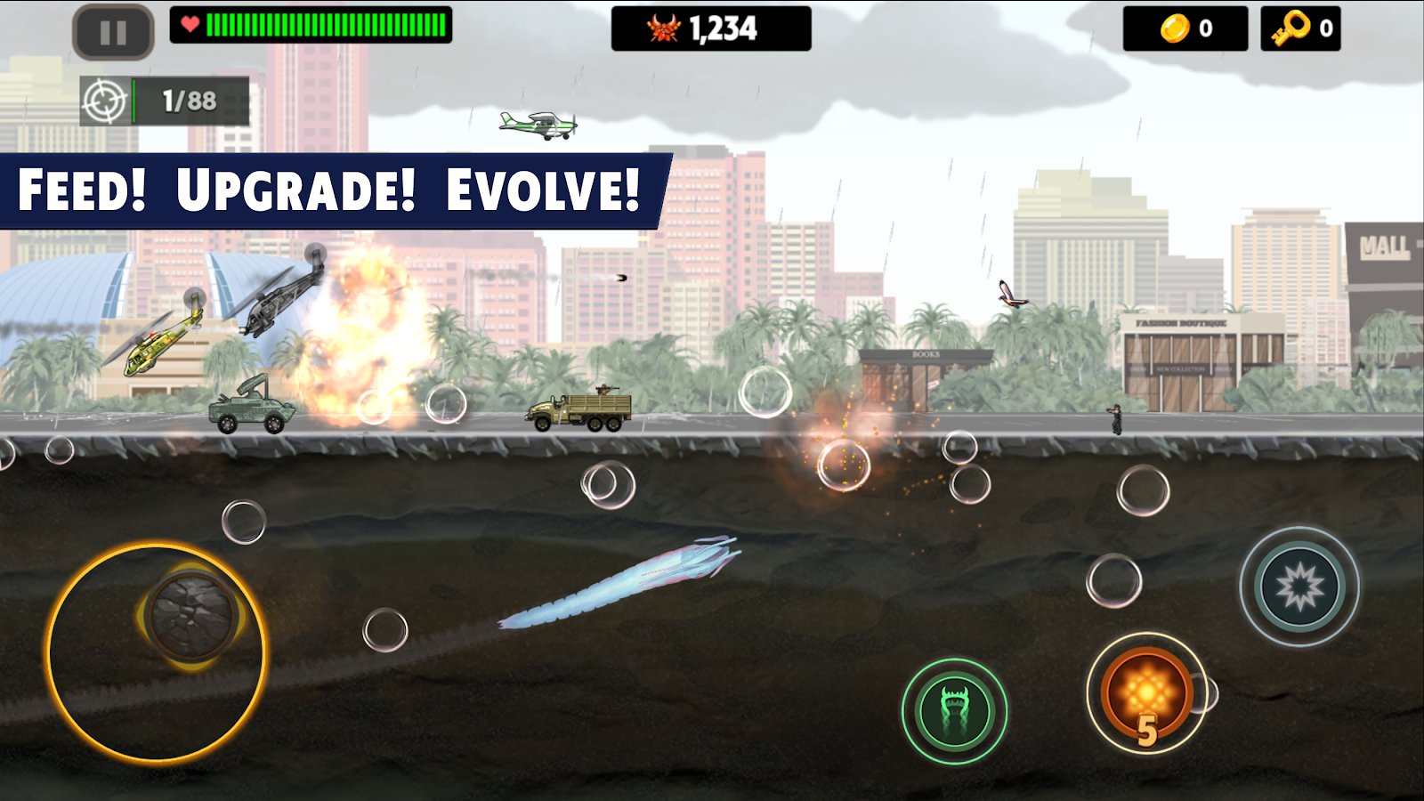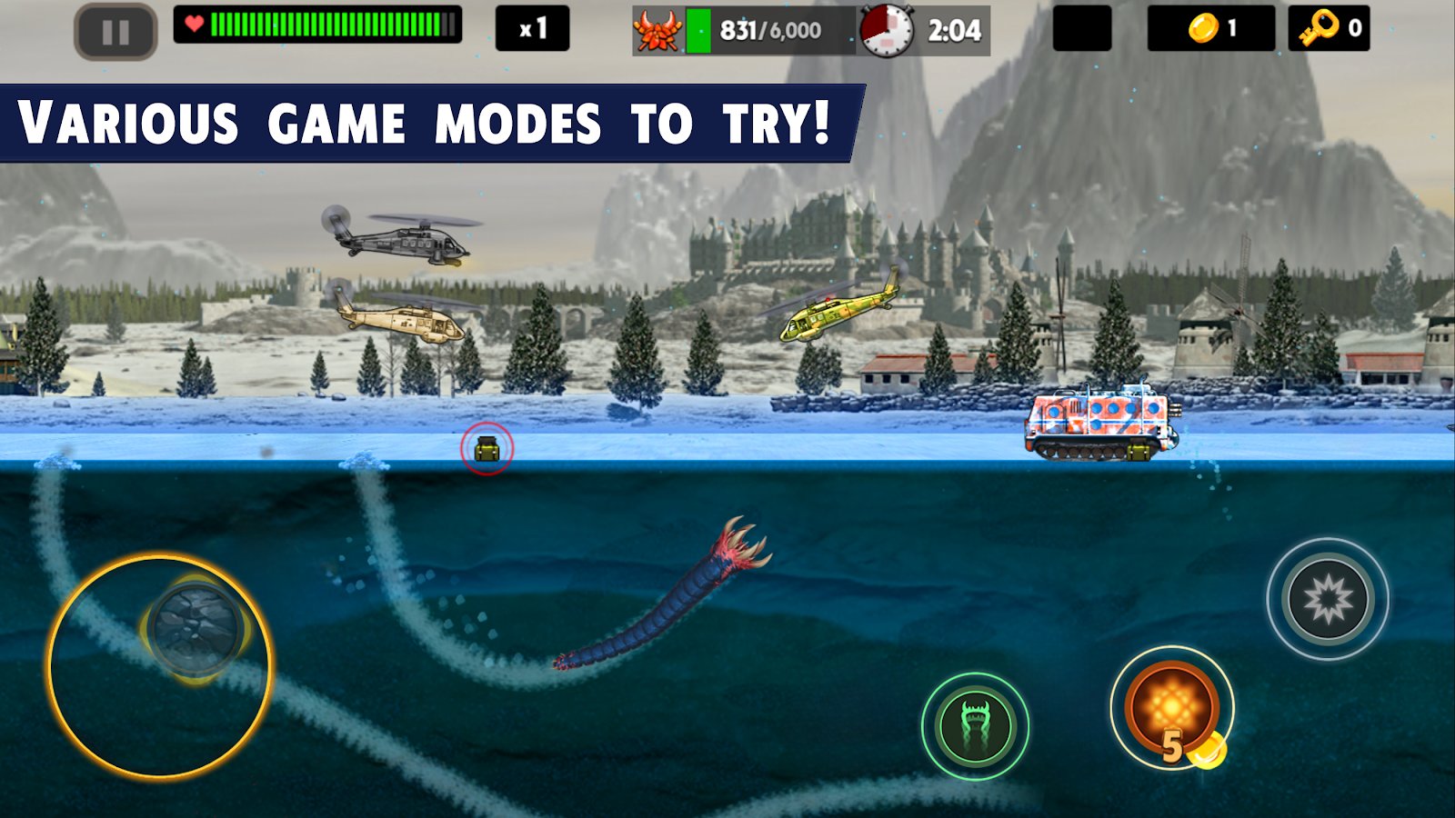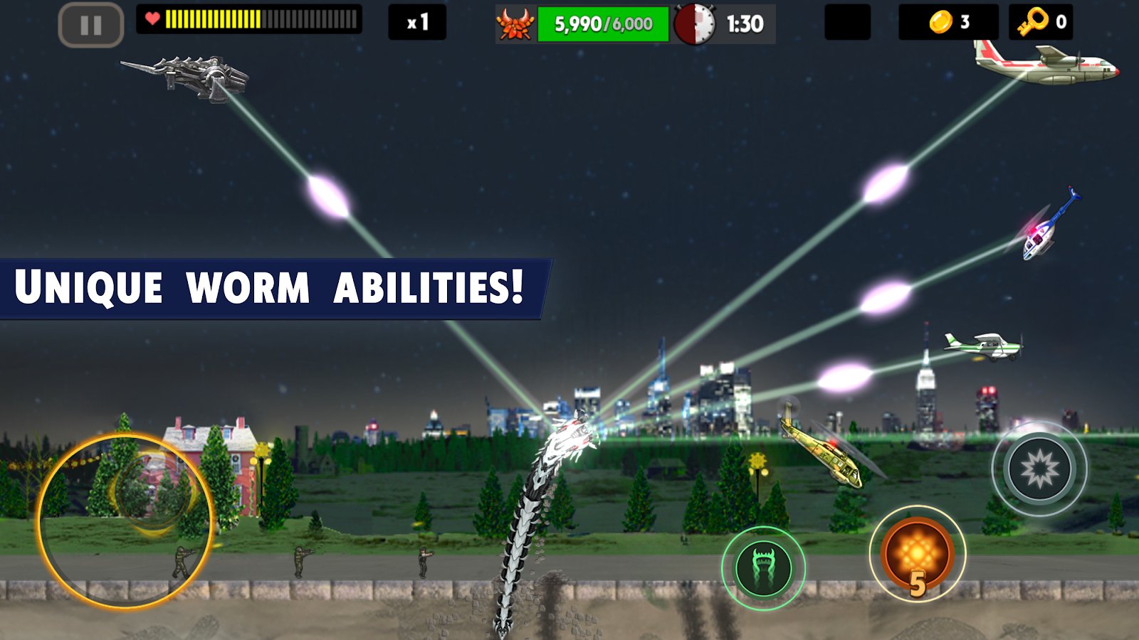 Death Worm - управляйте подземным чудовищем на Android! Ваш смертельный червяк будет разрушать все вокруг - армии военных на вертолетах и машинах не смогут остановить вашего сильного боевика! Вылетайте из-под земли в самый неожиданный момент и поразите противника наповал! И даже НЛО с вами не справится! Покажите себя в роли всепожирающего червяка, лопающего людей и сбивающего самолеты как надоедливых мух! Вас ждет 45 уровней, 2 бонус-игры, 3 типа червя и 30 типов врагов. Итак, интересный сюжет и отличная графика не оставит вас равнодушными!