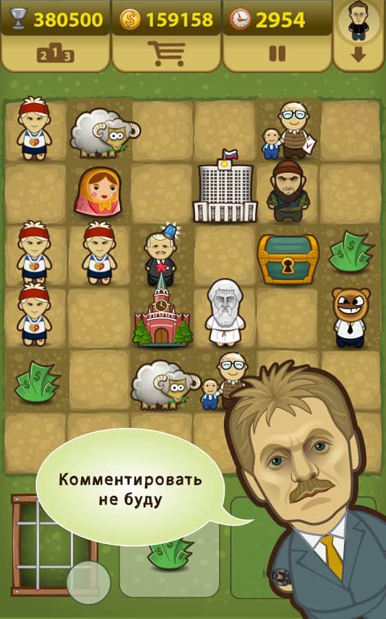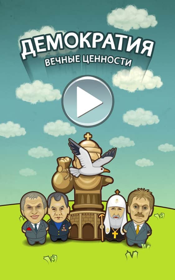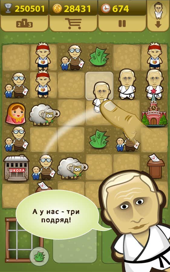 Игра Демократия - забавная и остроумная головоломка для андроид - о политической жизни страны. Суть игры - собирать три одинаковые фигуры и трансформировать их в более значимую. Дальше три более значимые - в еще более авторитетную, и т.д. по этому принципу. Но не все так просто и банально! В игре особая атмосфера и все продумано до мелочей: сначала собираешь стадо овец из пучков травы, превращаешь их в избирателей (эдакий пенсионер с лысинкой), избирателей — в школы, школы — в участки для голосования, ну а те, в свою очередь, превращаются в народных депутатов. Три депутата — Дума, три Думы — премьер. И так можно дособираться до царя. И вот понимаете, что игра чертовски сложна. Постоянно откуда ни возьмись появляются угрозы в виде полковника КГБ, генерала или назойливых агитаторов. Поэтому нужно внимательно продумывать ходы и заранее располагать в уме все фигурки, чтобы очень рационально использовать клетки. Но есть и помощники, так сказать. Это пила и бабло. Пилить можно Госзаказ и вредных и ненужных персонажей, а баблом восполнять нужные фигурки. А для того, чтобы сохранить фигурку впрок, ее можно поместить в тюрьму. Согласитесь, что возможность буквально посадить за решётку некоторых политических деятелей – весьма заманчивое предложение?