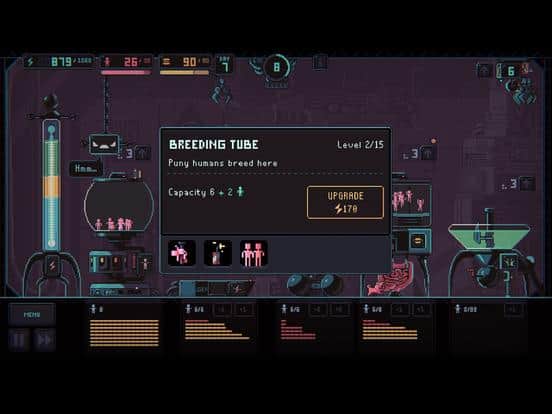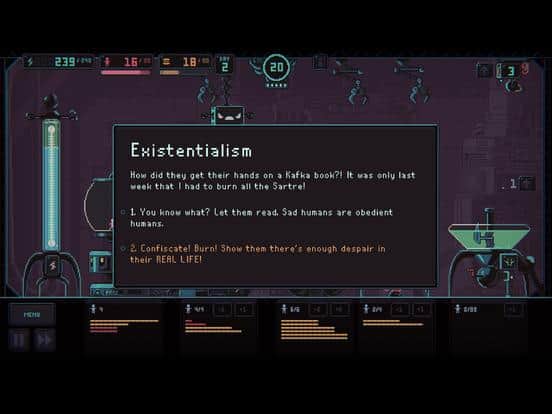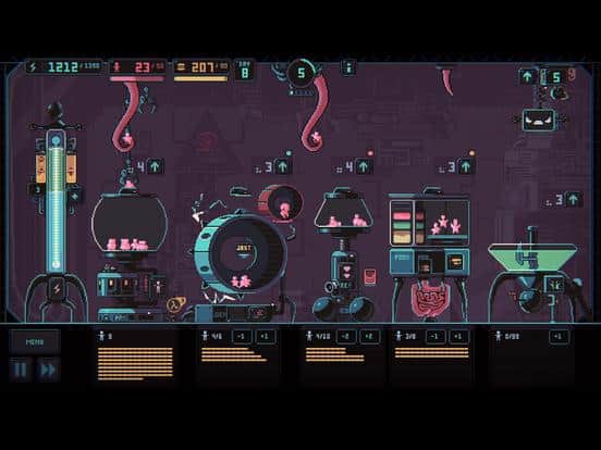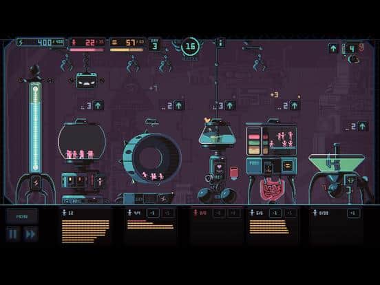 Despotism 3k – стратегия с элементами рогалика для IOS, где вы будете порабощать человечество. В этой игре вы перенесетесь в эпоху где миром правит искусственный интеллект и манипулирует людишками которые должны добывать ему энергию. Постройте свою огромную империю и следите за тем чтобы люди выполняли свою работу и не умирали от голода и усталости. Вашей главной задачей в игре будет перемещать людишек между двумя зданиями с помощью механических клешней. В одном здании люди должны отдыхать, размножатся и добывать себе еду, а в другом работать, добывая энергию, которой катастрофически не хватает. Игра порадует вас черным юмором, многочисленными миссиями и квестами.