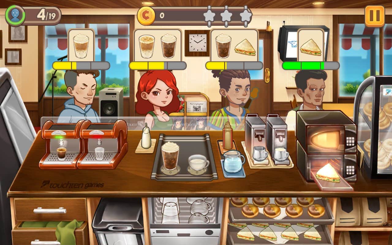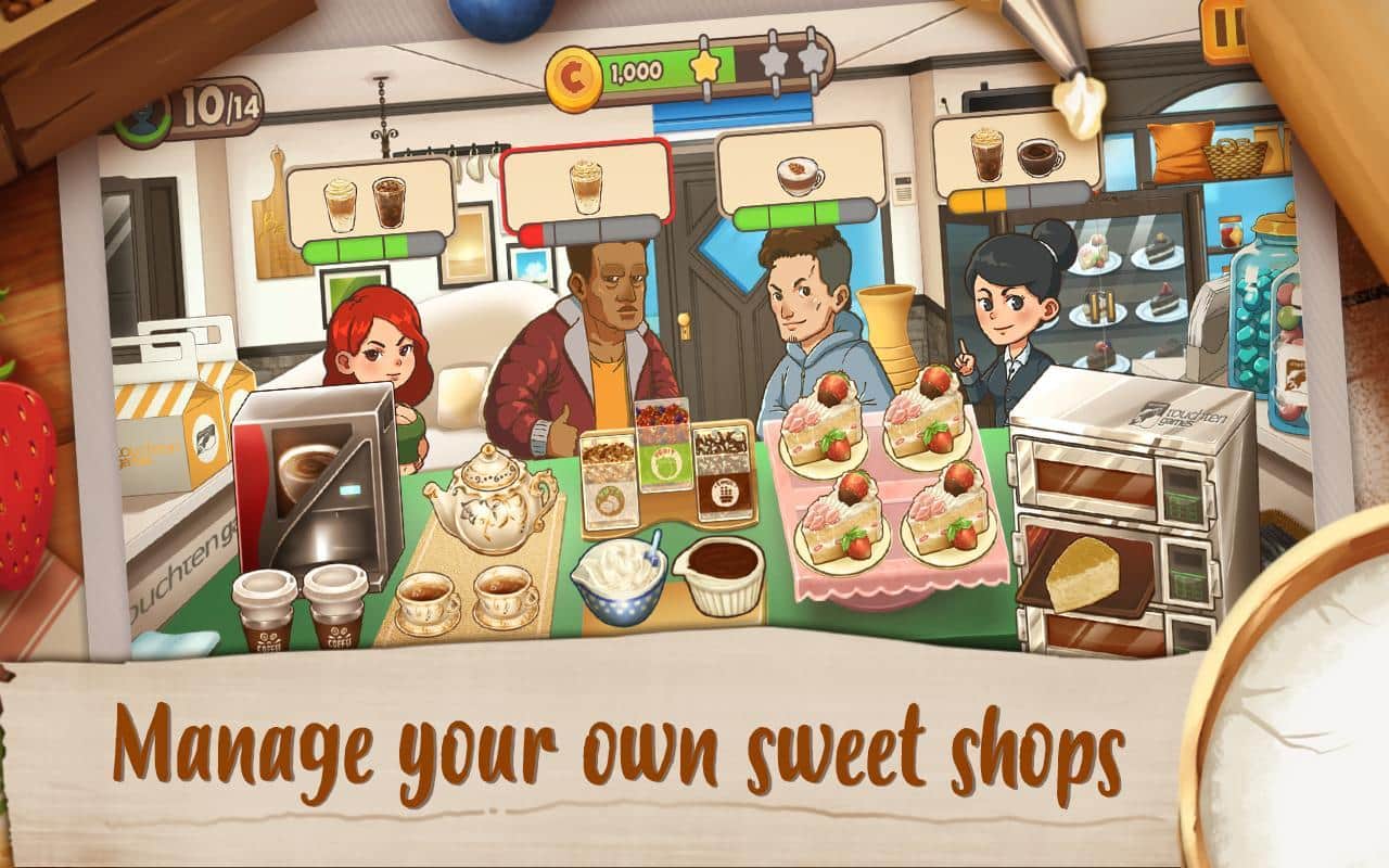 Dessert Chain: Coffee & Sweet – веселая игра на андроид, где вы станете владельцем популярного кафе. В вашем кафе подают великолепное кофе и вкусные пирожные и печенья. У вашей стойки уже выстроилась огромная очередь из клиентов и вашей задачей будет точно и быстро выполнять заказы всех посетителей и получать ценные чаевые. Заваривайте ароматное кофе и открывайте для себя новые рецепты его приготовления. Готовьте вкусные и разнообразные десерты, чтобы постоянно удивлять и радовать своих посетителей вкусными пирожными. Играйте в эту игру и наслаждайтесь отличной графикой, многочисленными и разнообразными персонажами, а также удивительными рецептами.