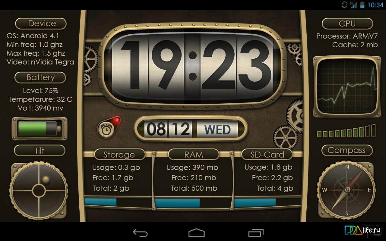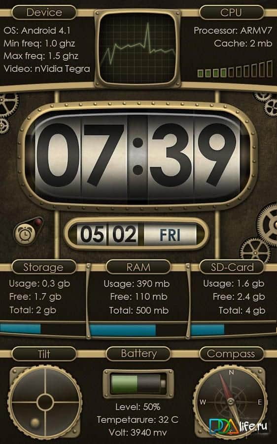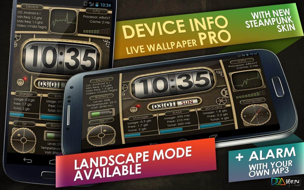 Device info ProClock Wallpaper – интересные и функциональные живые обои для андроид устройств от разработчика appMink.com. Данные обои порадуют вас не только своим стилем, но и отображением большого количества полезной информации о состоянии вашего устройства, а именно: состояние заряда батареи, температура, компас, напряжение, внутренняя и внешняя память, будильник и многое другое. Кроме того обои отображают текущую дату и время. Приятного пользования!