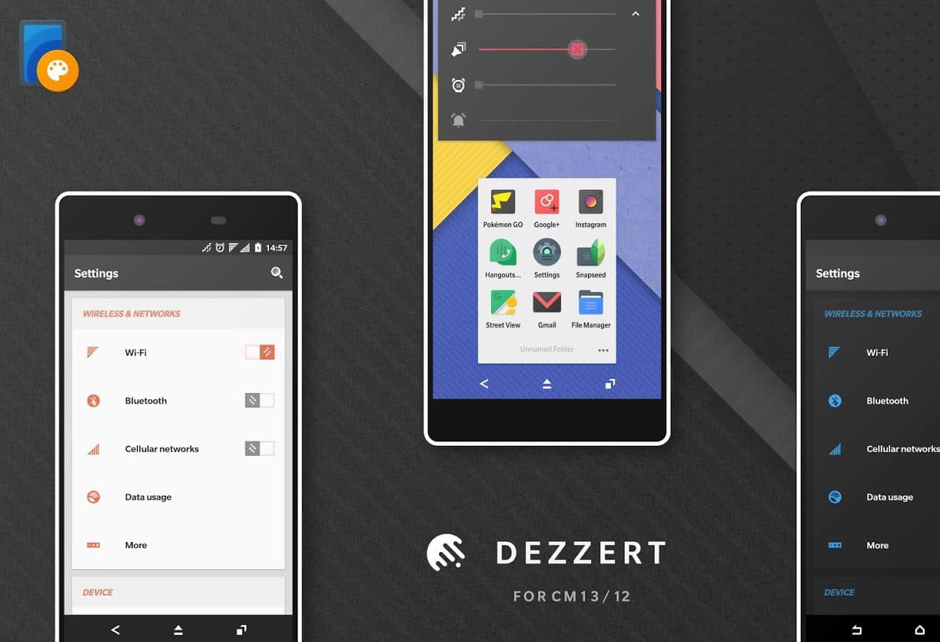 Dezzert CM12/CM13 Theme - Уникальная тема которая объединила в себе простоту и многогранность. С её помощью вы сможете создать свой уникальный стиль. Более чем 13 различных вариаций цветов, удобная панель звука, а так же мгновенный доступ к настройкам с помощью дополнительных панелей. Все это меняется и настраивается для каждого пользователя индивидуально. А в добавок ко всему этому, данное приложение содержит целый набор иконок и обоев для рабочего стола, что сделает ваш смартфон не только практичным но и красивым.