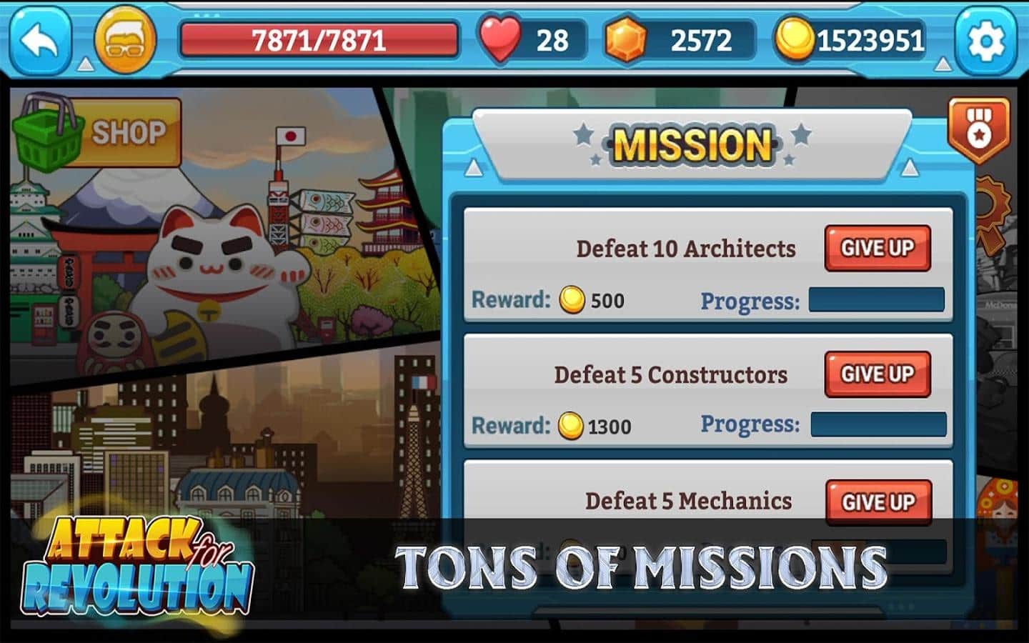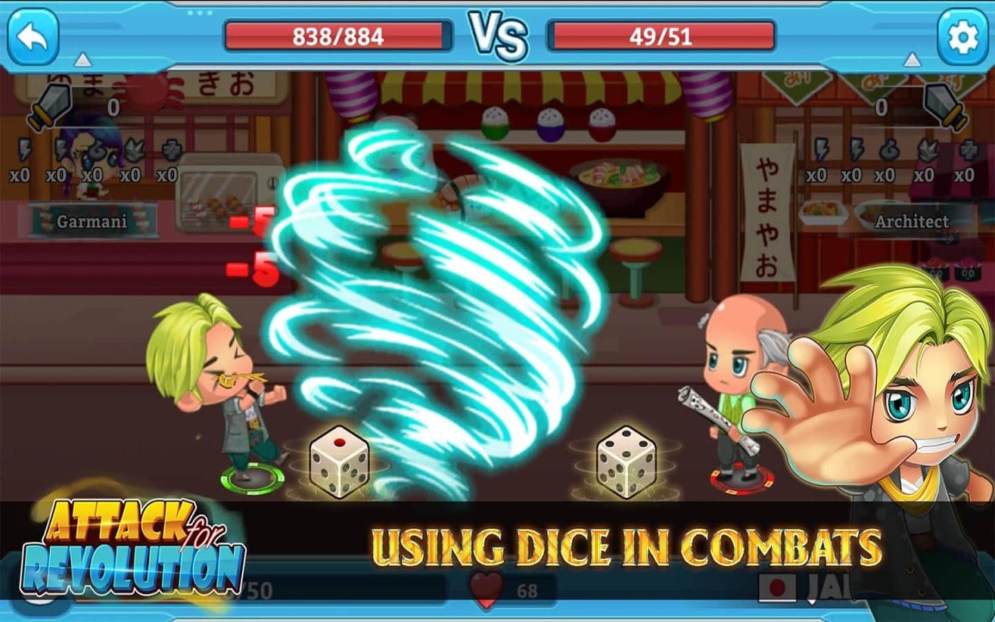 Dice Empire - Fighting Boss - увлекательная ролевая игра сюжет которой развивается в некой альтернативной вселенной, вселенной в которой вся власть принадлежит корпорациям и их босам. Обычные же люди подвергаются постоянным нападкам и вынуждены существовать в нелегких условиях. Как известно подобное положение вещей не может длиться вечно и озлобленные люди собравшись в альянсы и коалиции выступили против тиранов. В отличие от столь пафосного сюжета игровой процесс выглядит куда более проще, ваша задача выбрать персонажей, набрать команду и принимать участие в боях из разряда стенка на стенку. Игровой процесс построен по случайному принципу, кидая игральные кости вы получите возможность сделать ход в зависимости от выпавшего значения.