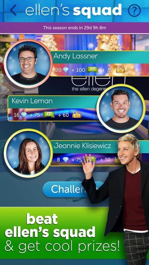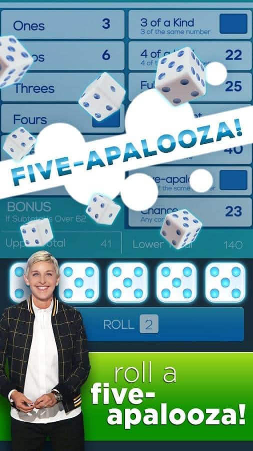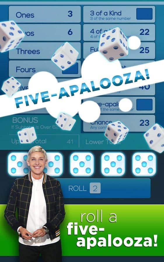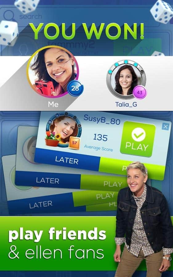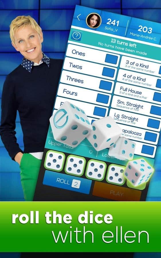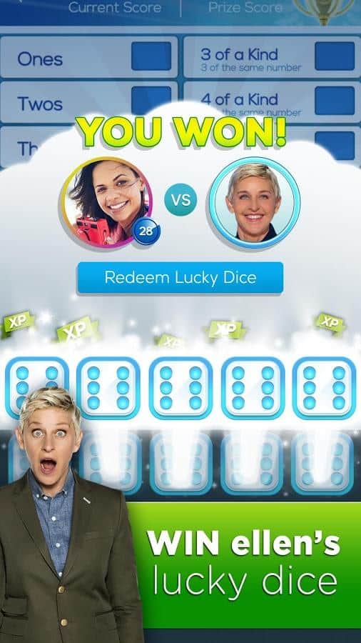 Dice with Ellen – настольная игра на андроид, где вы будете кидать кости, получать выигрышные комбинации и получать отличные призы. В этой игре вы сможете бросить вызов многочисленным соперникам, среди которых будет знаменитая телеведущая Эллен Дедженерес и ее команда. Играйте со своими друзьями и кидайте кости на игровое поле, проверяя на деле свою интуицию и удачу. Выполняйте ежедневные задания и примите свое участие в увлекательных турнирах, которые будут проходить каждый день. Получайте отличные призы и награды, а также соберите все достижения и бонусы. Общайтесь с другими игроками в общем чате и проверьте в действии все режимы игры.