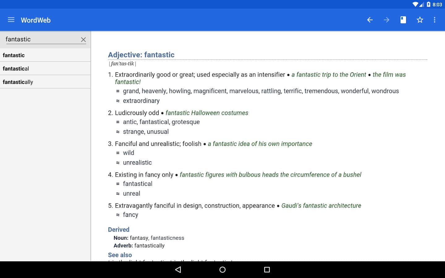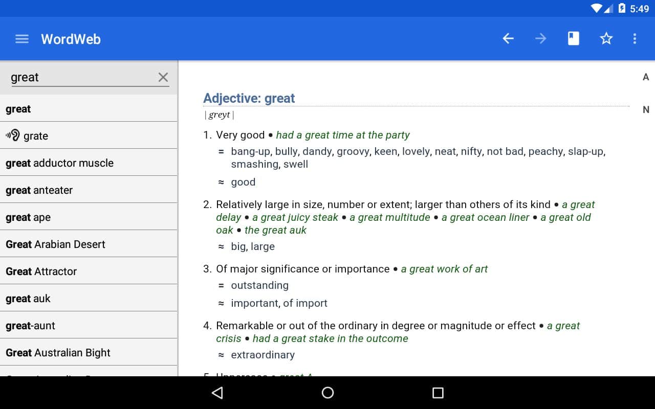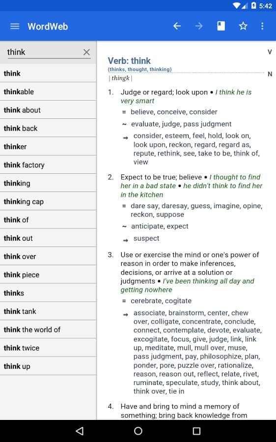 Dictionary - WordWeb - Это один из самых больших в мире оффлайн словарей по английскому языку. Здесь вы найдете целую кучу слов, с синонимами к ним, а так же пояснениями значений. При этом в это приложении довольно удобный поиск и полностью отсутствует реклама! Умный текстовый ввод, будет сам предлагать вам варианты слов, тем самым сэкономит ваше время.