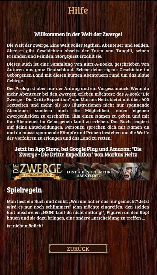 Die Zwerge – Prolog – Мир гномов. Мир, полный мифов, героев и опасных, авантюрных приключений. В последнее время интерактивные книги или книги-игры стали популярны среди мобильных игроков. Вы как будто читаете обычную книгу, но в тоже время можете влиять на её сюжет и это действительно очень здорово. Книга представляет собой сборник Немецких писателей. Приключенческие истории в мире Голубых Гор. В прогологе как и полагается предоставлено самое интересное. Предвкушения следующих глава просто зашкаливает, а всё потому что текст писали профессиональные писатели. Приятного чтения и игры!